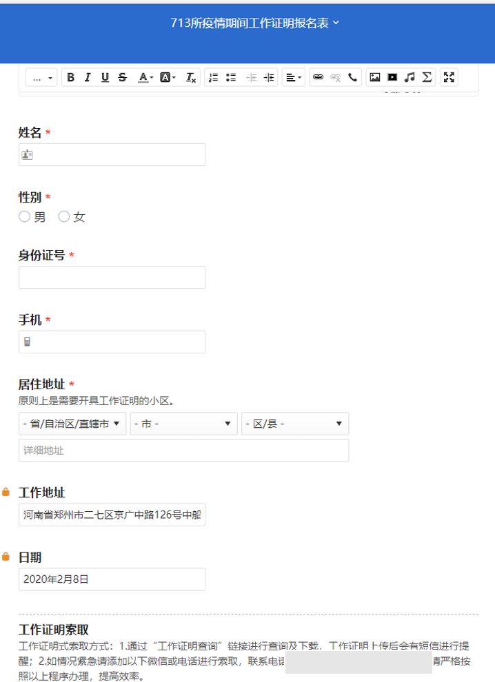 创建表单就是设计一个让大家填写复工证明信息收集的页面。