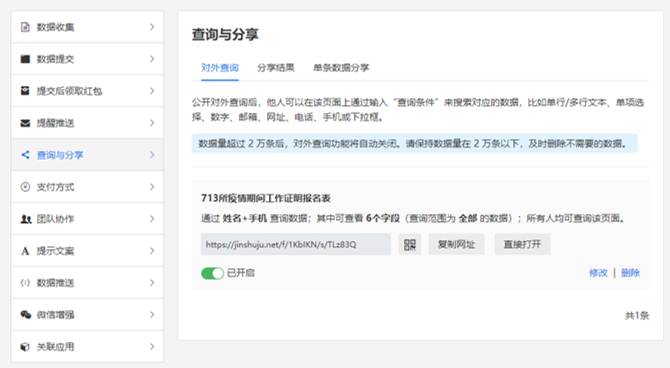 在金数据后台的设置页,进入查询与分享页面,将该表单的对外查询打开。