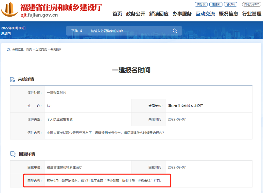 三、福建省住房和城乡建设厅回复用户来信:称一建报名将于9月中旬开启。