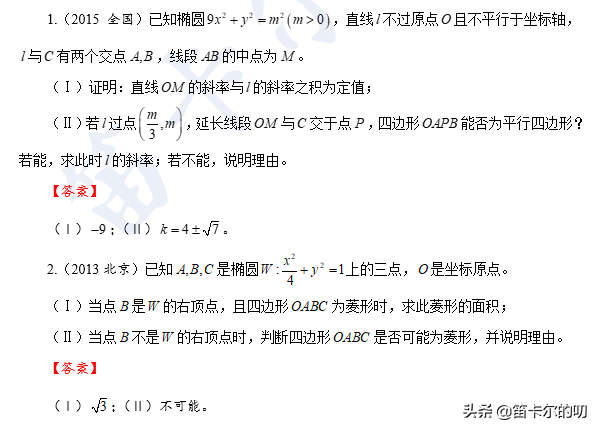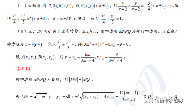 法1,一组邻边相等的平行四边形是菱形,利用弦长公式与距离公式求得两邻边长,通过邻边相等建立方程,由于方程无解,故菱形不存在。