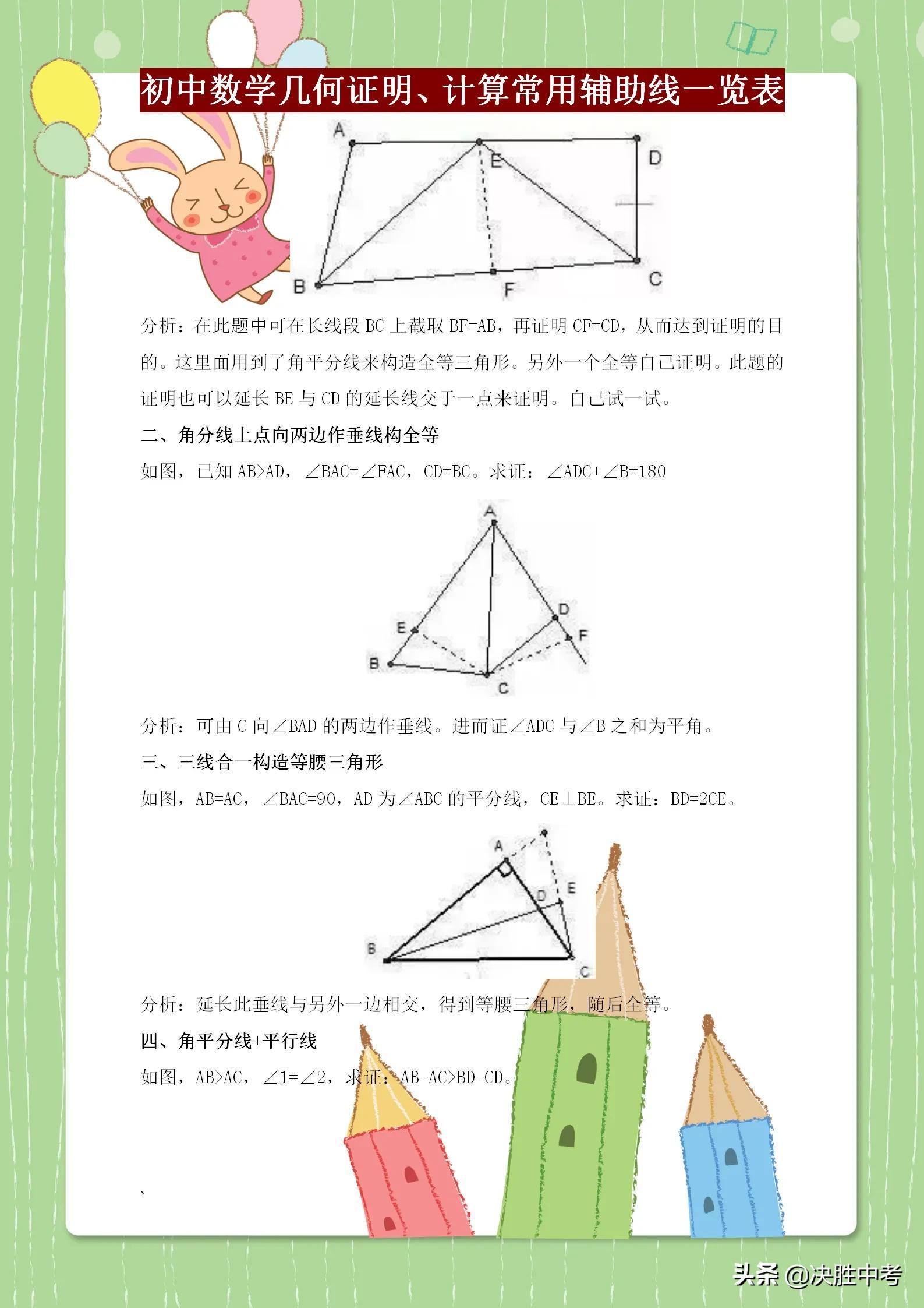 在考试之中,很多学生不会做的压轴题,只要老师随便提点一下如何去作辅助线,很多学生就会恍然大悟,如醍醐灌顶,其本质的原因就是对辅助线运用的不熟悉。