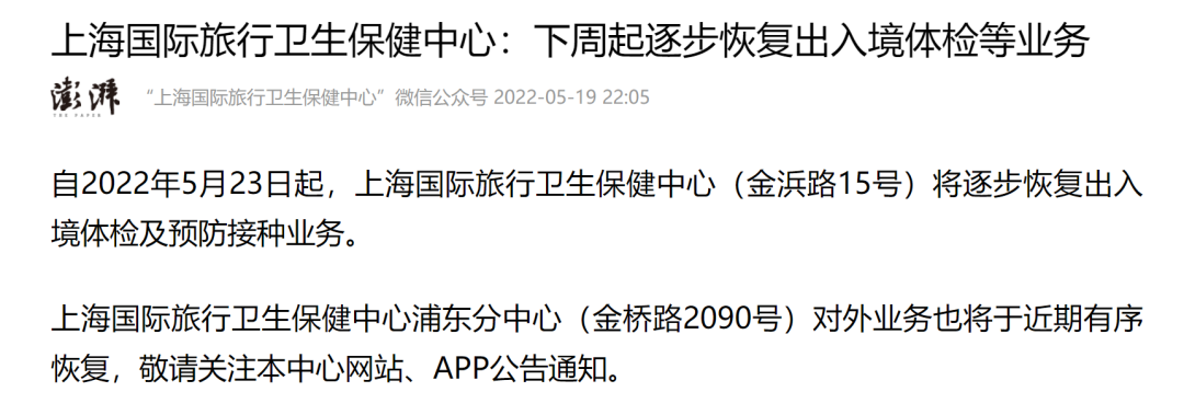 此外,附上一则好消息,随着上海复工进程的推进,上海国际旅行卫生保健中心也即将开放入境体检业务。