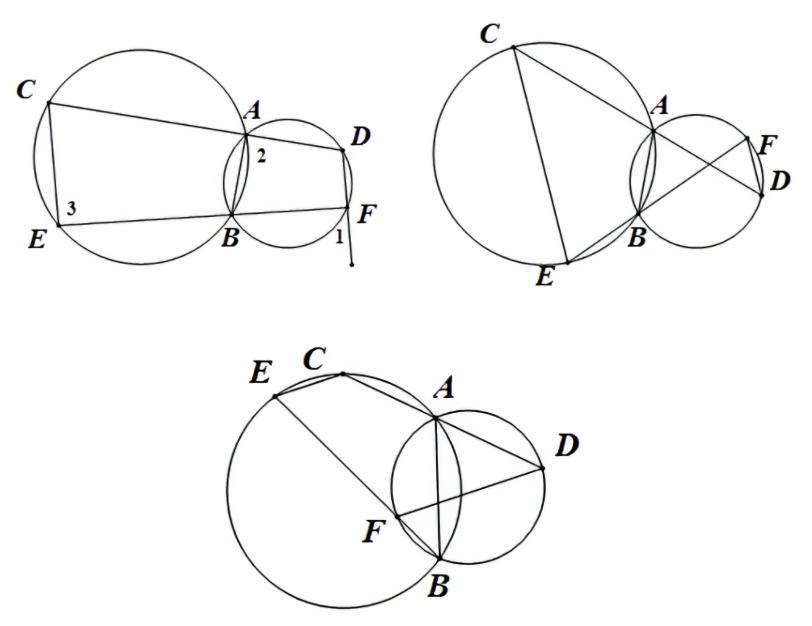 已知:两圆相较于 A、B,通过两交点各作一直线 CAD、EBF,止于两圆。 求证:CE//DF。