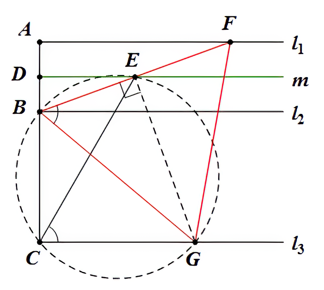 以中间线 l2 为一边,作正三角形 ABC,其中 A、C 在 l2 上,B 在 l1 上;作 BC 的延长线,交 l3 于 D 点;作角 DAE 等于 60 度,交 l1 于 E 点;连接 DE。三角形 ADE 即为所求。 证明略和四点共圆角度关系有关的证明当然远不止以上两题,另外比较著名的问题是三角形三条高线共点的证明,以及反演圆的做法。除此以外,在《几何明珠》这本书中,用到四点共圆角度关系的包括婆罗摩及多定理、九点圆、斯坦纳-雷米欧司定理、蝴蝶定理、西姆松定理、米凯尔圆定理,这里就不一一列举了,敬请读者阅读欣赏。