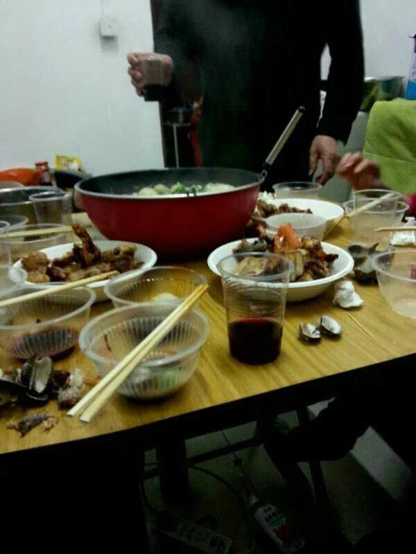 再一次回到厦门本岛已经是八点多了,又不知道怎么走,打电话给旅店老板娘,老板娘还是很热情,可还是走了很久才找到地方,饿的前心贴后背。除夕夜看着街上稀稀拉拉的行人,民居及远处高楼里的万家灯火,突然感觉自己像卖火柴的小姑娘,又冷又饿,瞎子阿炳的二泉映月,似乎在耳边响起。可怜太太。春节都想回家,坐炕上和家人看春晚多美。但计划了很久的事情不能改变,(并非计划旅游)。就在此时旅店老板娘电话过来,说是去她家吃年夜饭,我都蒙了,还有这等好事,三步并两步就去了。一进门大家都开吃了,正面是旅店老板,左边这小伙还是户县人,从上海过来。真是有缘分,右边的小伙大家叫他马云,因为他真的和马云很像,给马云做替身绝对可以。但没有阿里巴巴的马云就悲催了。锅里的碗里的都是海鲜,不认识。松管,反正饿了,开吃。。。。跟老板,户县娃,马云一人来一杯,还是白的,后来吃的实在吃不下了才停,帮老板收拾了桌子,知道他们也不是厦门本地人,是福建漳州的,过年没回家。总之这个除夕过的很意外,很温暖,对厦门的好印象直线上升。