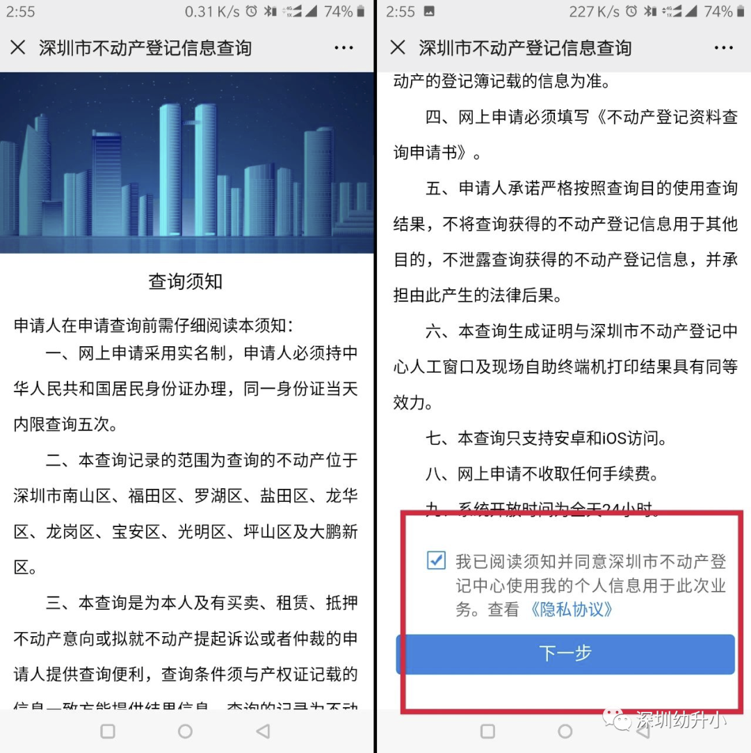 进入查询须知页面,阅读后勾选“我已阅读须知并同意”,点击“下一步”。