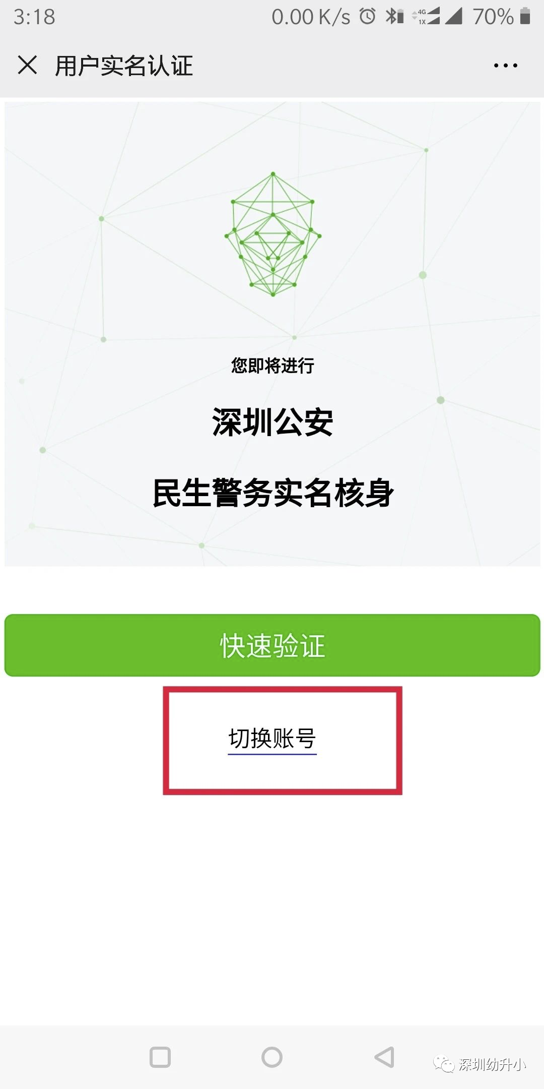 如果需要查询其他人的无房证明,可以在“用户实名认证”页面点击下方的“切换账号”,按系统提示输入个人信息并刷脸认证即可。该系统连接深圳市公安人脸识别系统进行实名核验,不用担心其安全性和真实性。