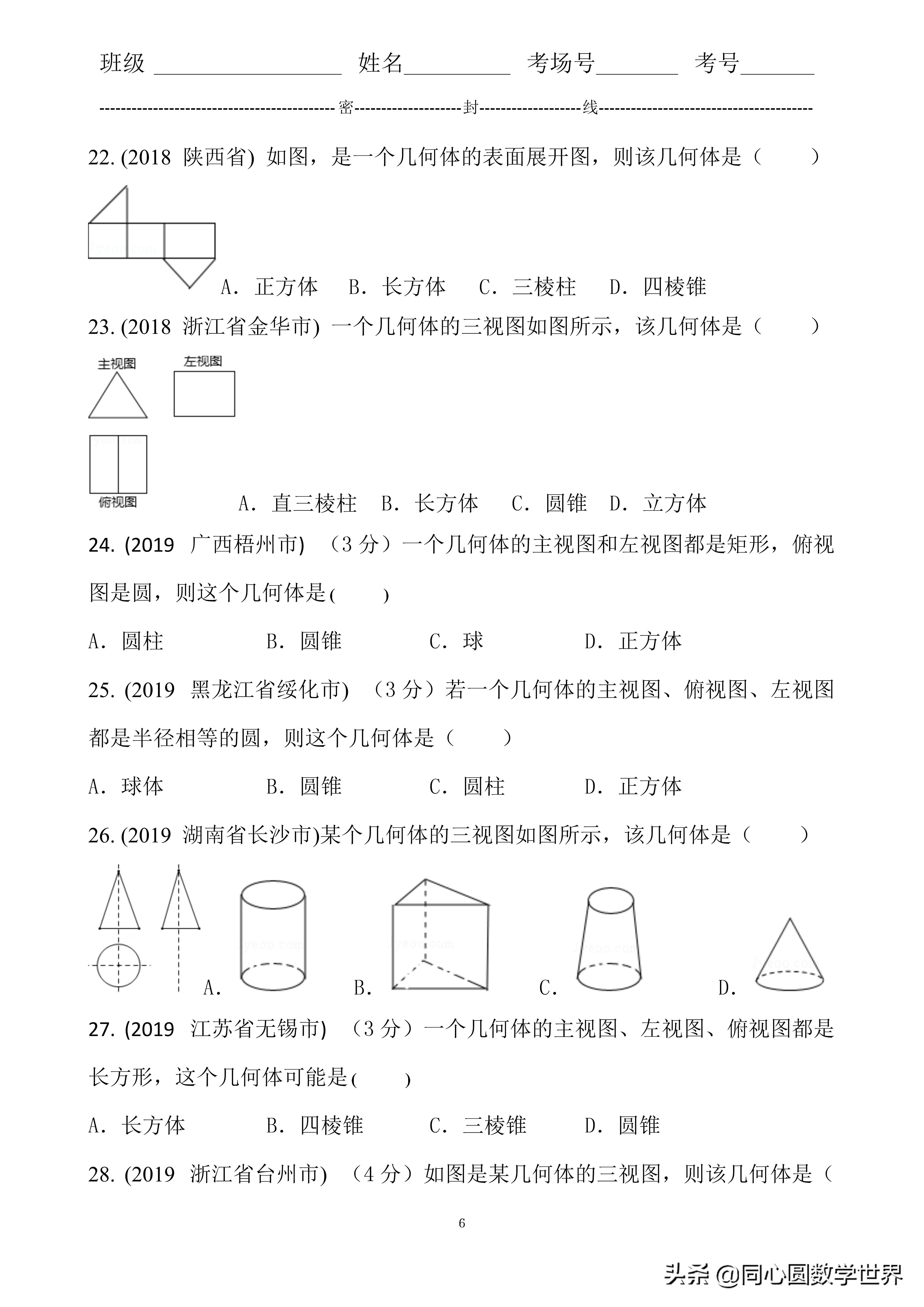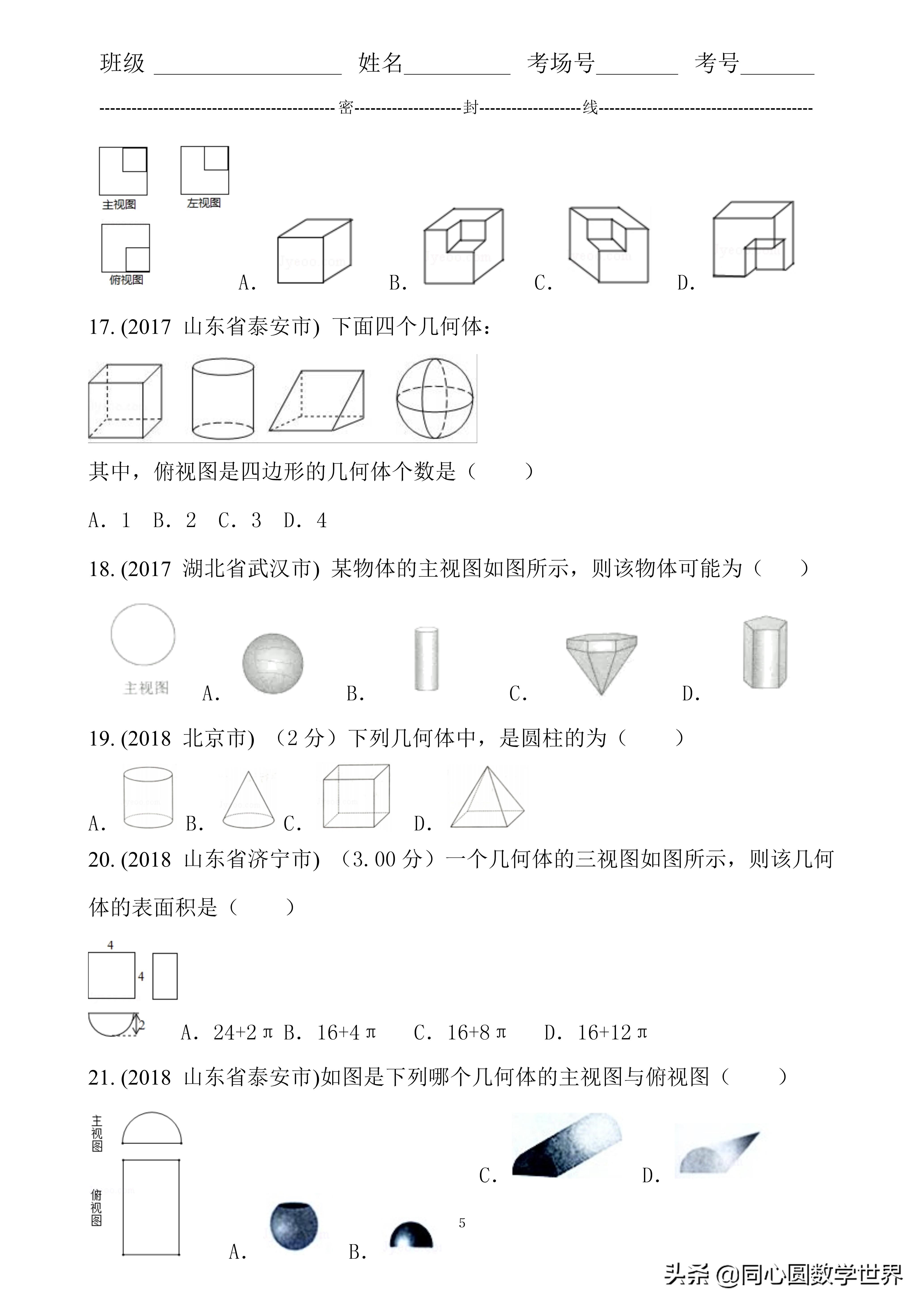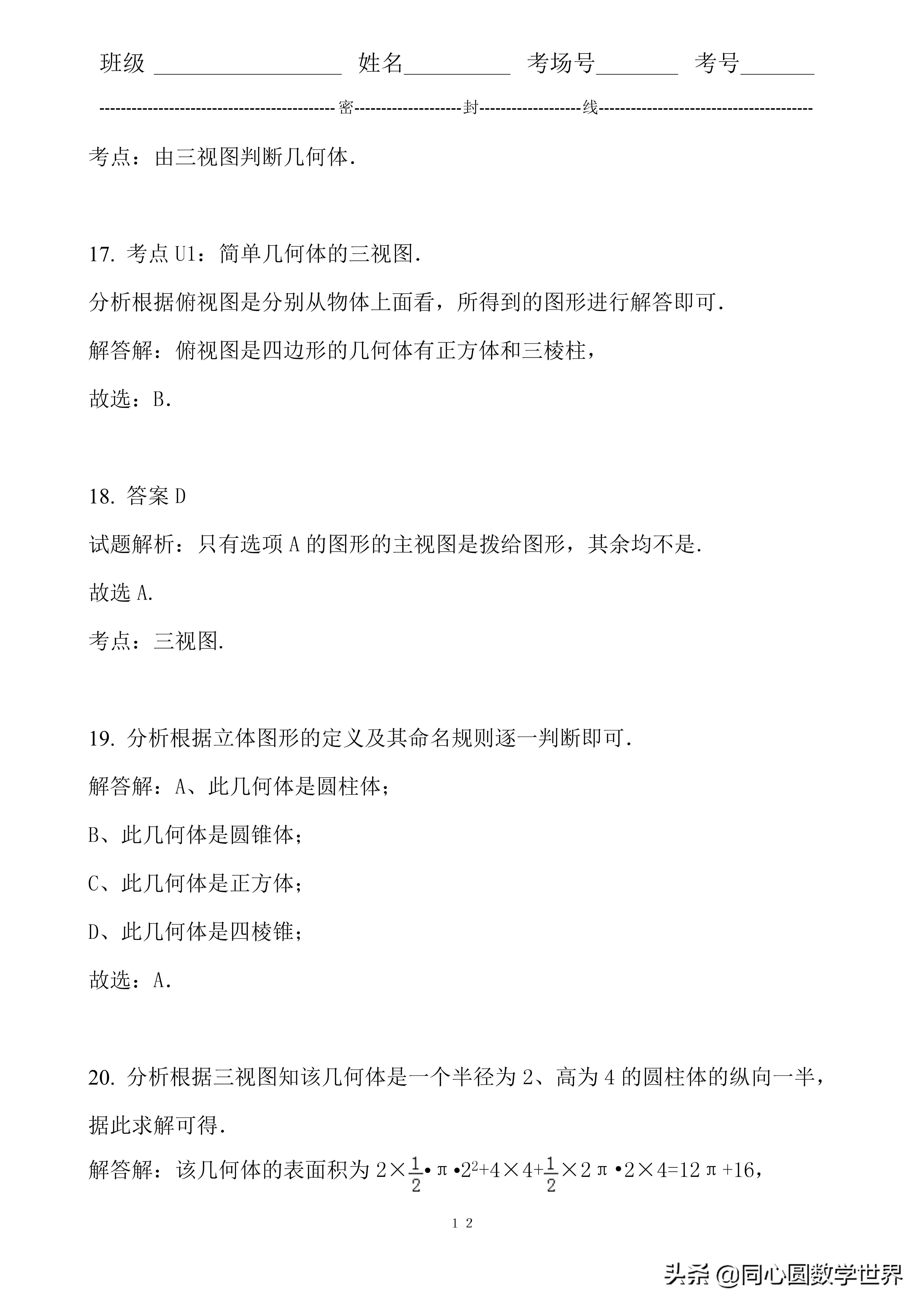 18. 答案D试题解析:只有选项A的图形的主视图是拨给图形,其余均不是.故选A.考点:三视图.