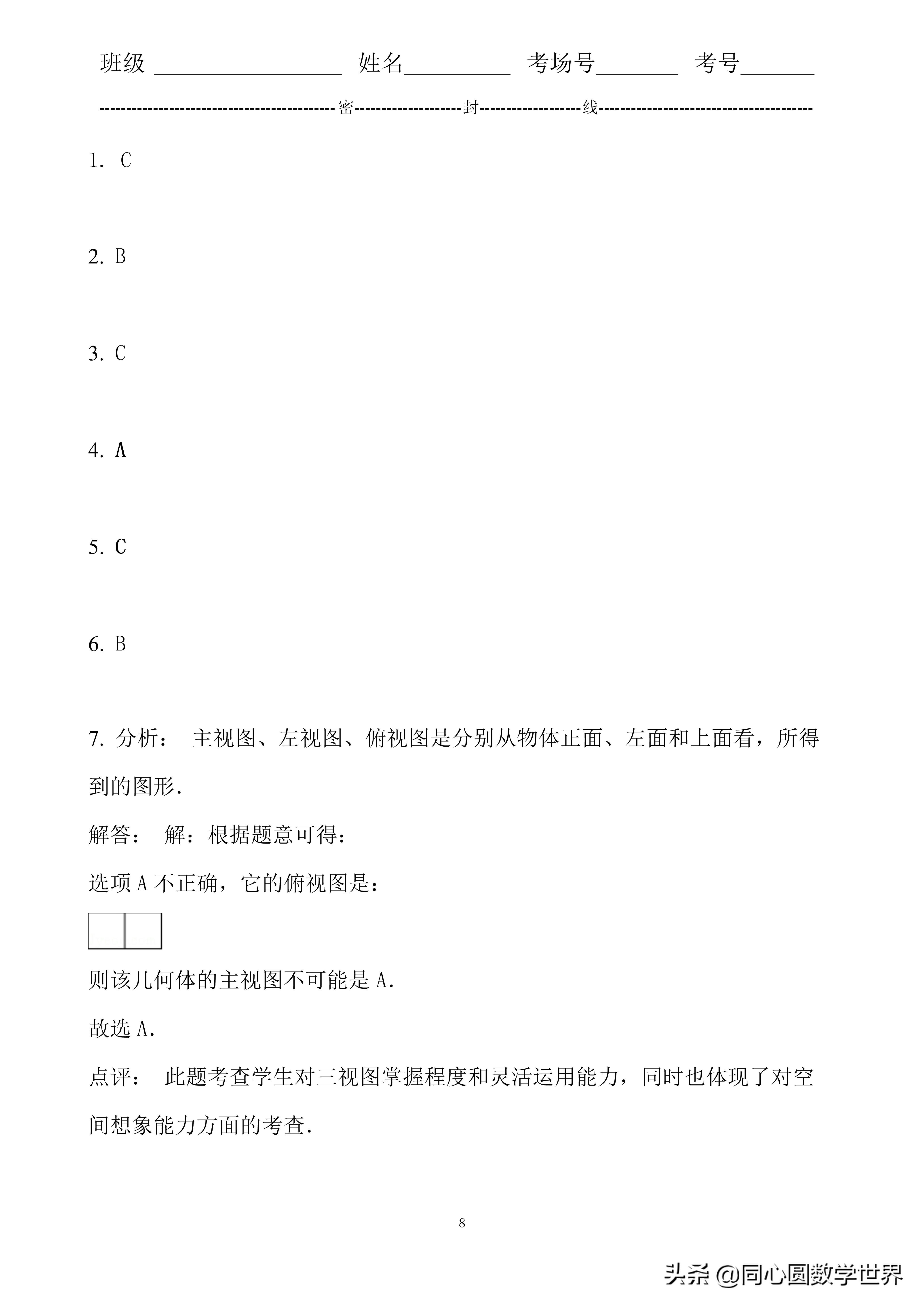 7. 分析: 主视图、左视图、俯视图是分别从物体正面、左面和上面看,所得到的图形.解答: 解:根据题意可得:选项A不正确,它的俯视图是:则该几何体的主视图不可能是A.故选A.点评: 此题考查学生对三视图掌握程度和灵活运用能力,同时也体现了对空间想象能力方面的考查.