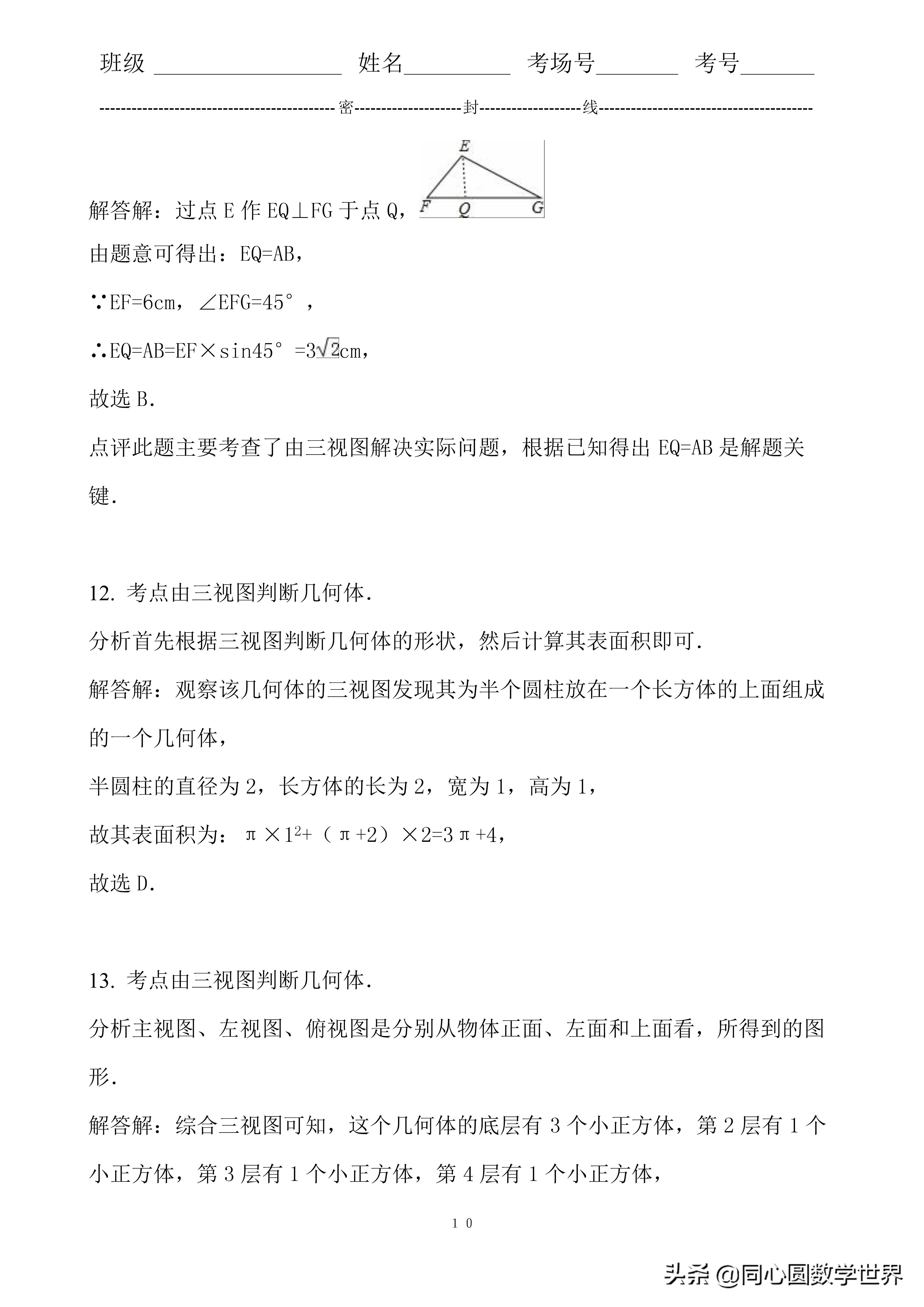 11. 考点由三视图判断几何体.分析根据三视图的对应情况可得出,△EFG中FG上的高即为AB的长,进而求出即可.点评此题主要考查了由三视图解决实际问题,根据已知得出EQ=AB是解题关键.