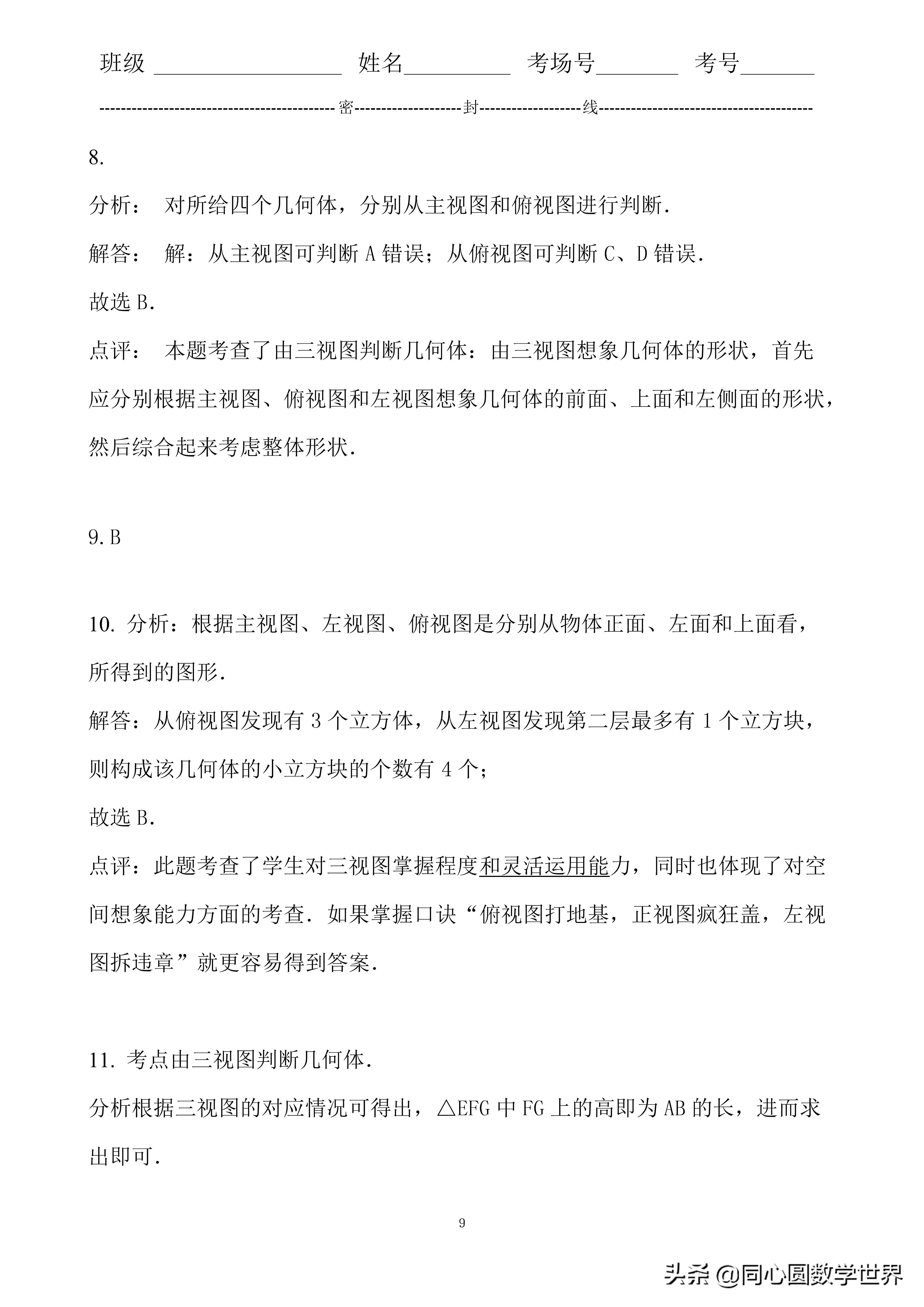 8.分析: 对所给四个几何体,分别从主视图和俯视图进行判断.解答: 解:从主视图可判断A错误;从俯视图可判断C、D错误.故选B.点评: 本题考查了由三视图判断几何体:由三视图想象几何体的形状,首先应分别根据主视图、俯视图和左视图想象几何体的前面、上面和左侧面的形状,然后综合起来考虑整体形状.