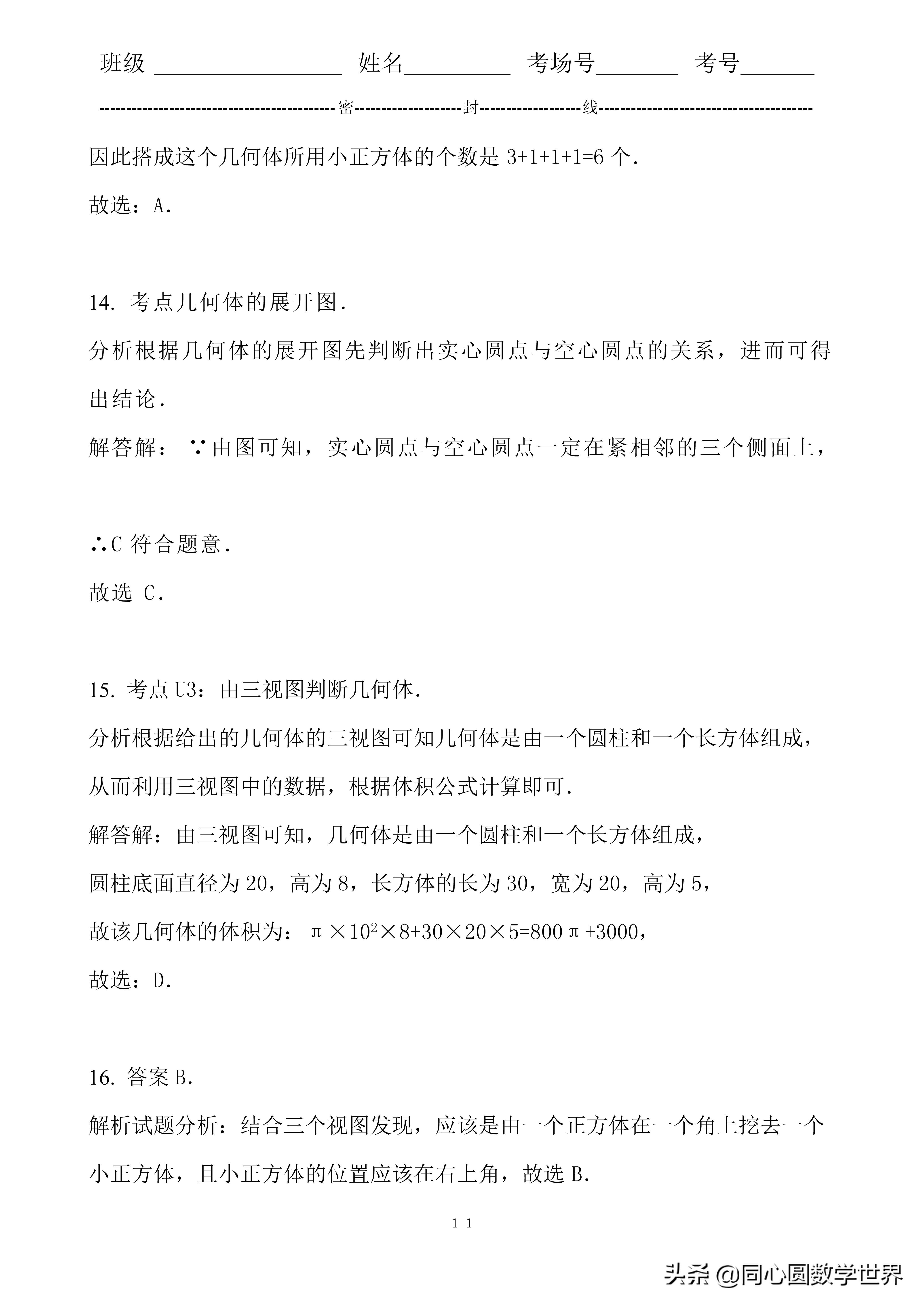14. 考点几何体的展开图.分析根据几何体的展开图先判断出实心圆点与空心圆点的关系,进而可得出结论.解答解:∵由图可知,实心圆点与空心圆点一定在紧相邻的三个侧面上,∴C符合题意.故选C.