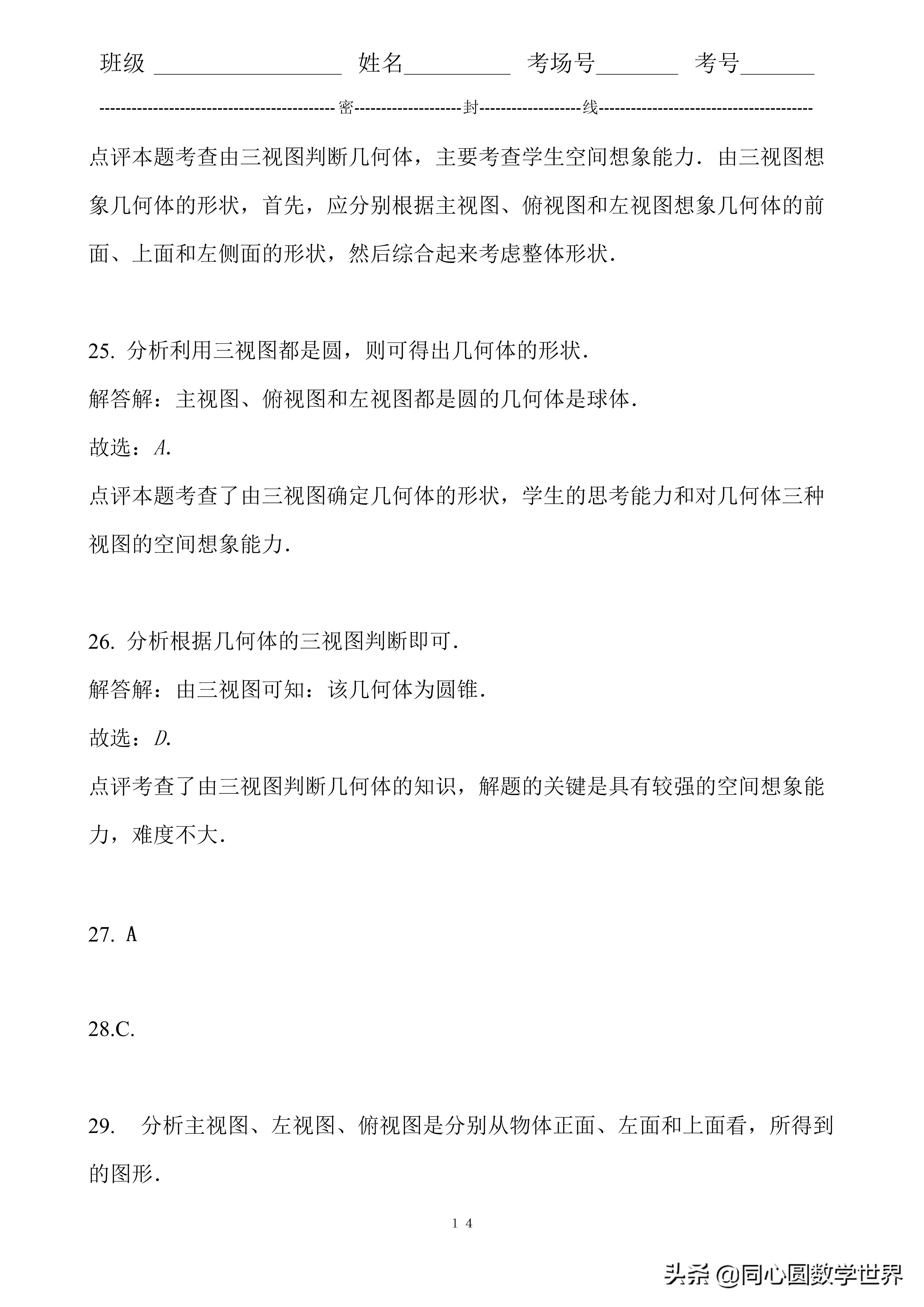 26. 分析根据几何体的三视图判断即可.解答解:由三视图可知:该几何体为圆锥.