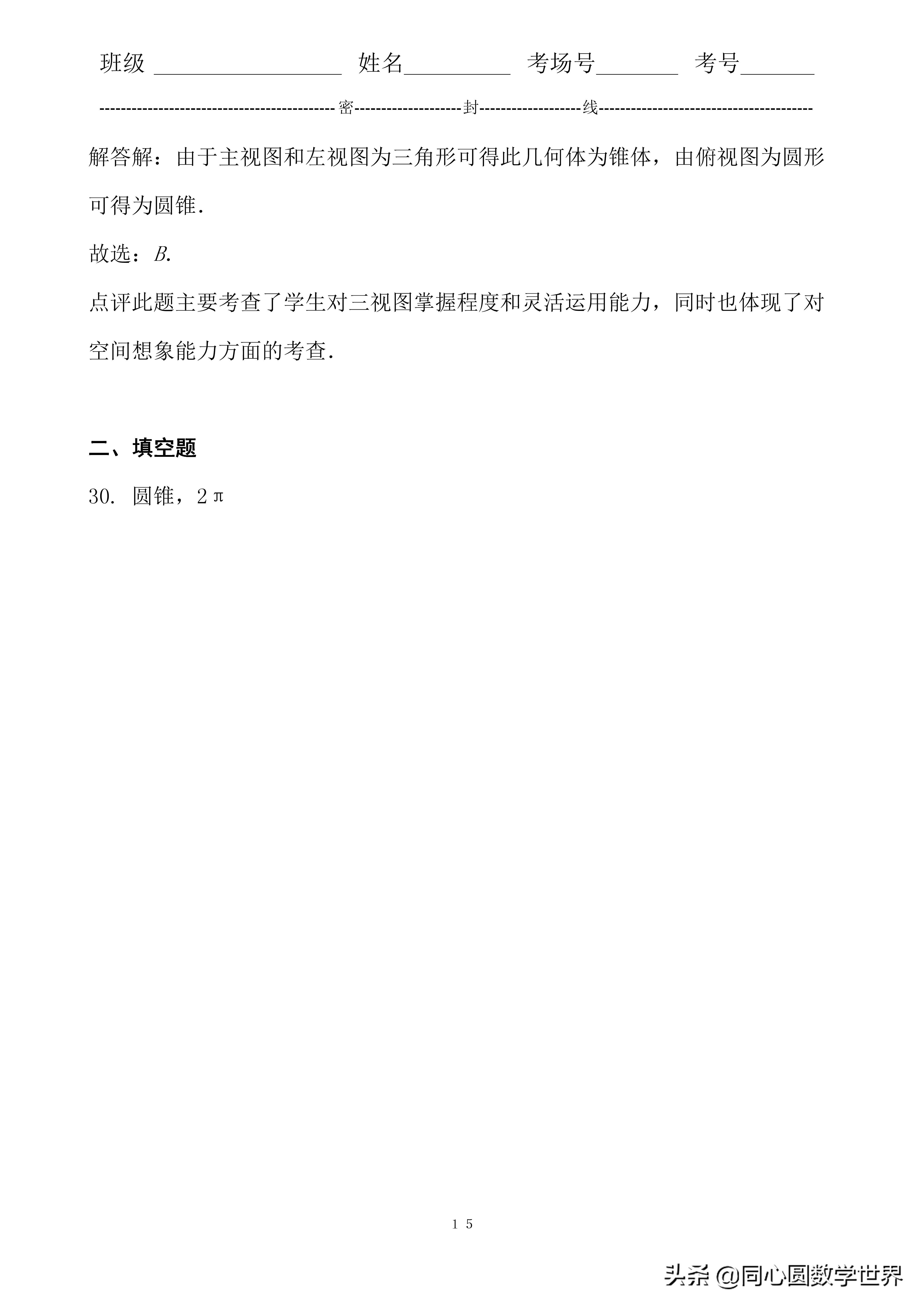 29. 分析主视图、左视图、俯视图是分别从物体正面、左面和上面看,所得到的图形.解答解:由于主视图和左视图为三角形可得此几何体为锥体,由俯视图为圆形可得为圆锥.故选:B.点评此题主要考查了学生对三视图掌握程度和灵活运用能力,同时也体现了对空间想象能力方面的考查.
