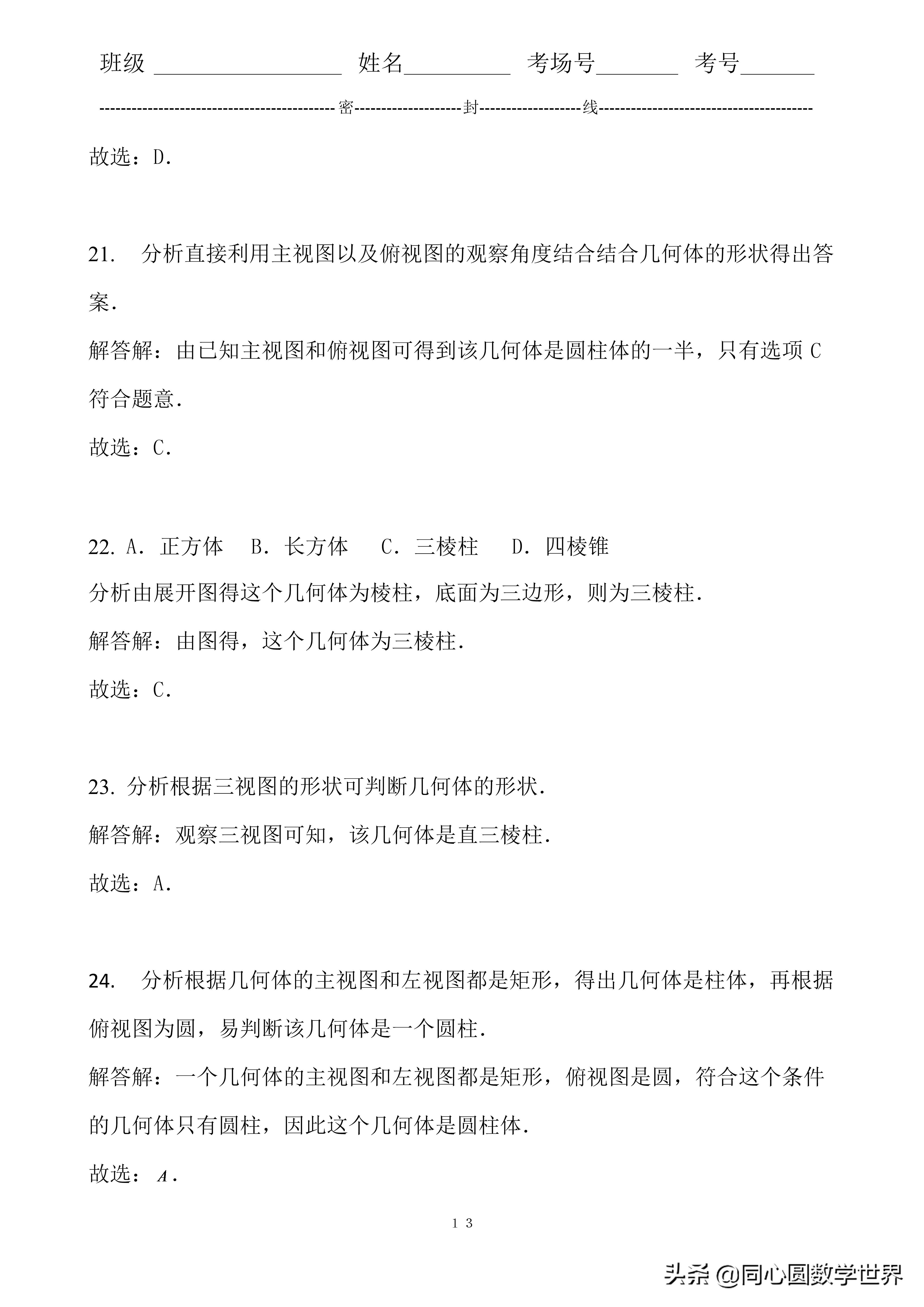 22. A.正方体 B.长方体 C.三棱柱 D.四棱锥分析由展开图得这个几何体为棱柱,底面为三边形,则为三棱柱.解答解:由图得,这个几何体为三棱柱.故选:C.