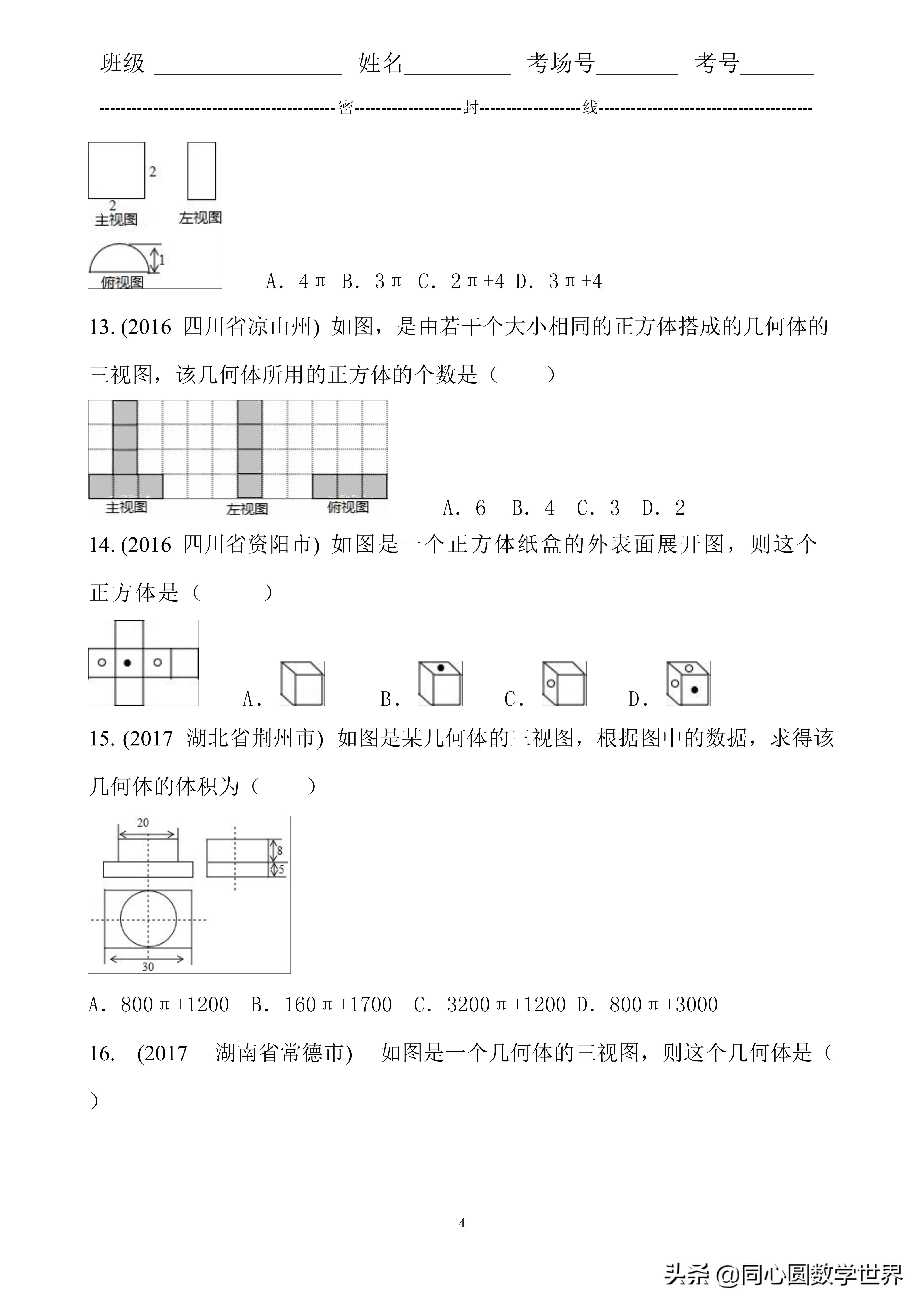 15. 考点U3:由三视图判断几何体.分析根据给出的几何体的三视图可知几何体是由一个圆柱和一个长方体组成,从而利用三视图中的数据,根据体积公式计算即可.解答解:由三视图可知,几何体是由一个圆柱和一个长方体组成,圆柱底面直径为20,高为8,长方体的长为30,宽为20,高为5,故该几何体的体积为:π×102×8+30×20×5=800π+3000,故选:D.
