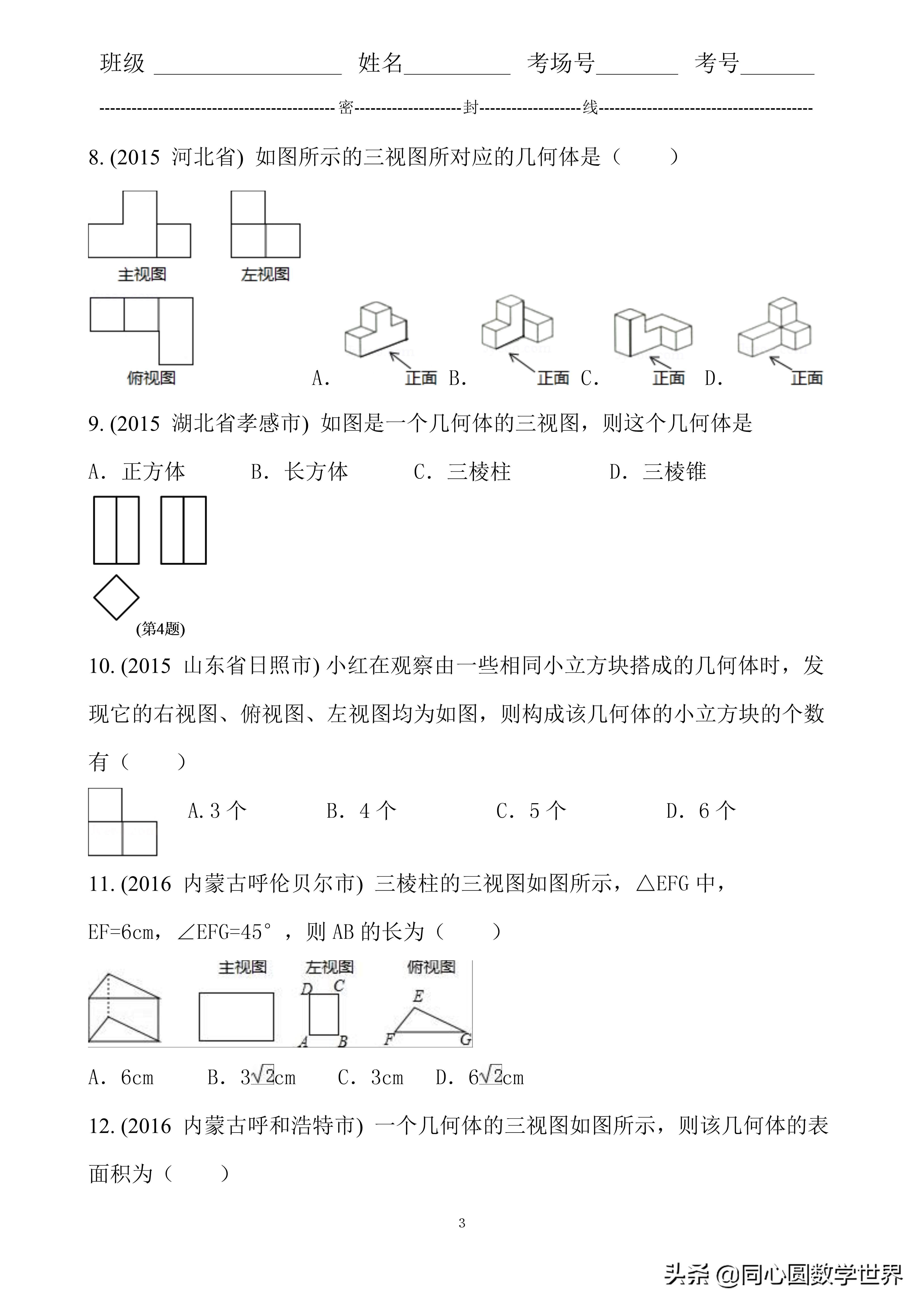 16. 答案B.解析试题分析:结合三个视图发现,应该是由一个正方体在一个角上挖去一个小正方体,且小正方体的位置应该在右上角,故选B.考点:由三视图判断几何体.