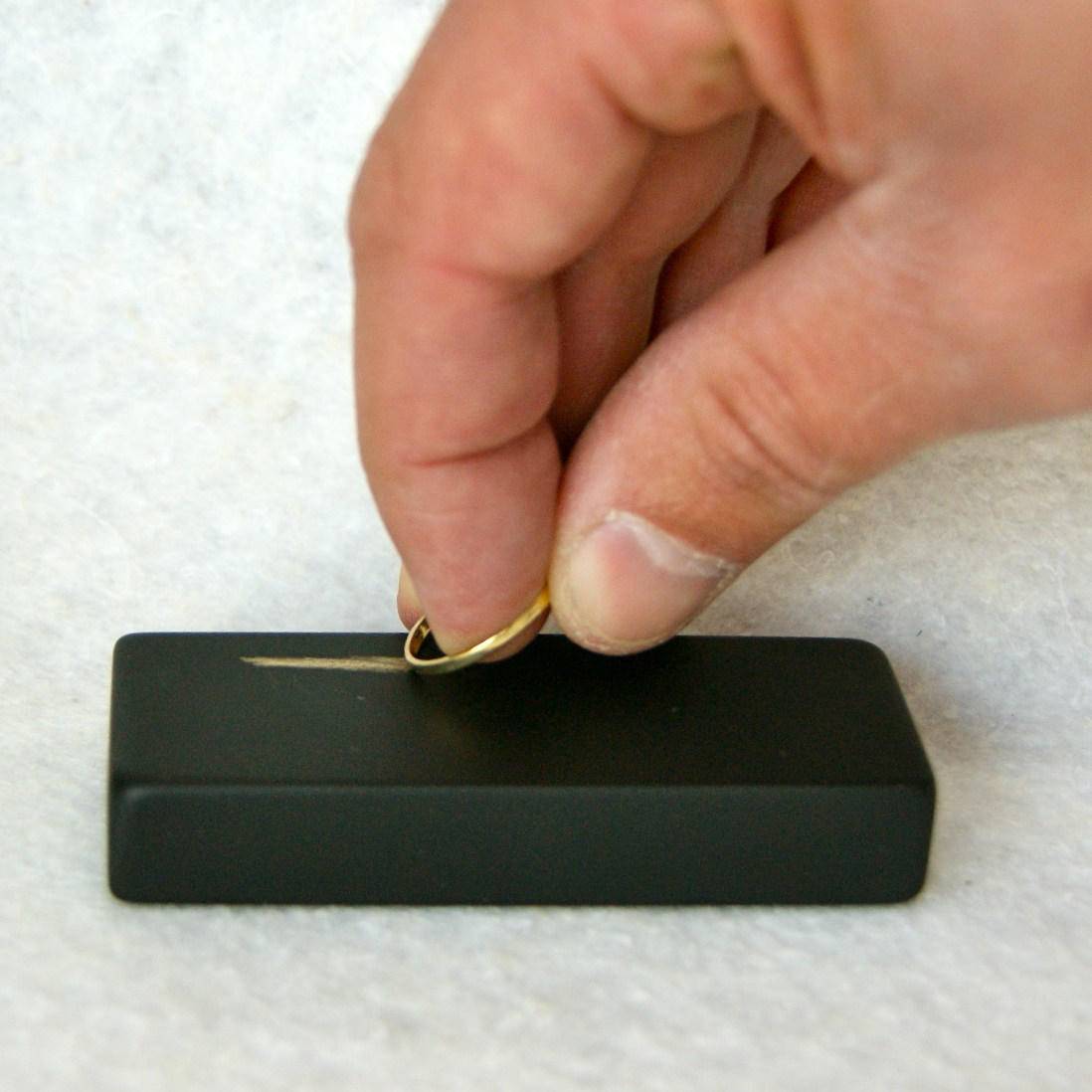 要想不破坏金子的形状又知道它的成色,古人想到了用试金石。试金石其实是一片黑色光滑的石英岩石,你将黄金在石头上摩擦时会在表面留下划痕。通过观察划痕的色彩、光泽,再根据经验,就可以判断这是不是真金,它的成色大约是多少。拿不准时,可以用已知纯度的黄金在边上摩擦摩擦,再进行比对。