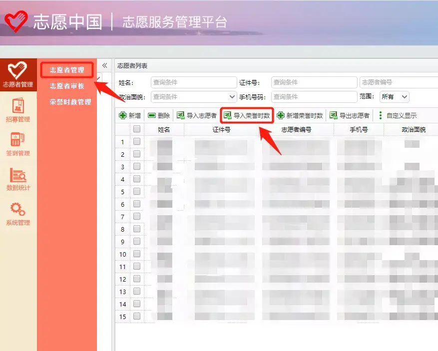 组织入驻成功后,组织管理员可在网页端登录管理平台(vms.zyz.org.cn),在“志愿者管理”功能中按要求上传相关文件,平台审核通过后即可为志愿者批量补时数。