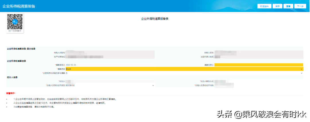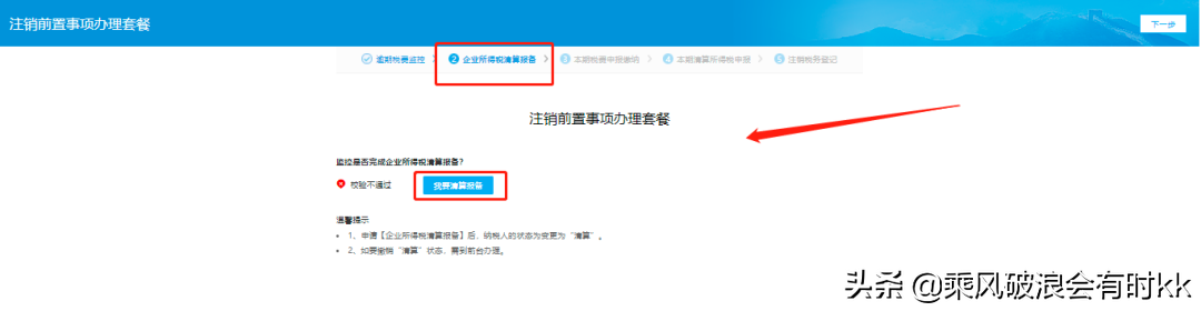 第三步:处理完欠税、处罚、逾期未申报后,可以进行【企业所得税清算报备】;点击【我要清算报备】,进入填写清算报备页面,录完企业所得税清算报备信息后,点击【下一步】,清算报备提交成功。