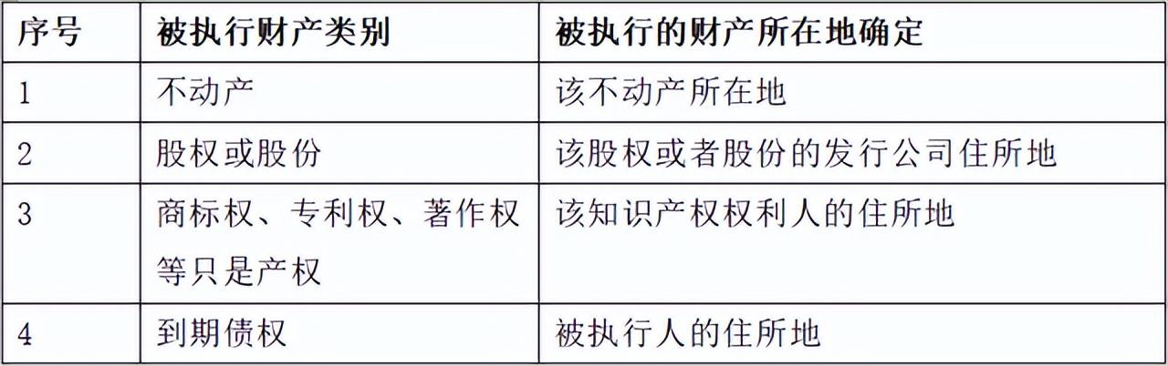 《人民法院办理执行案件规范》的第3条明确了四类特定被执行的财产所在地的确定: