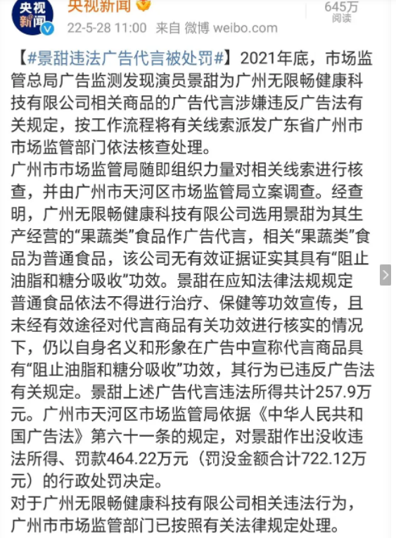 景甜违法代言,被罚722万