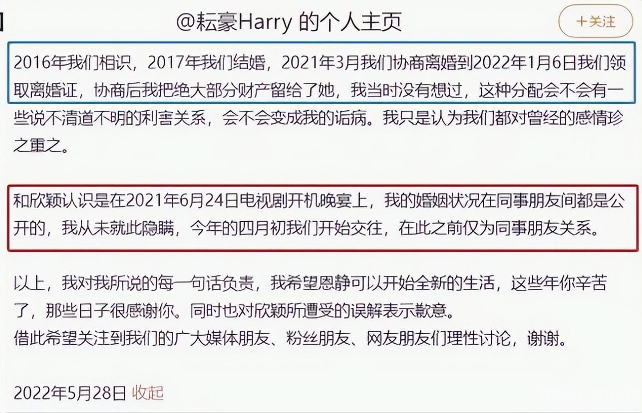 但这场出轨漩涡的中心人物,胡耘豪在5月28日以小作文回应称,自己没有婚内出轨,与杨欣颖恋爱时离婚后才开始的。