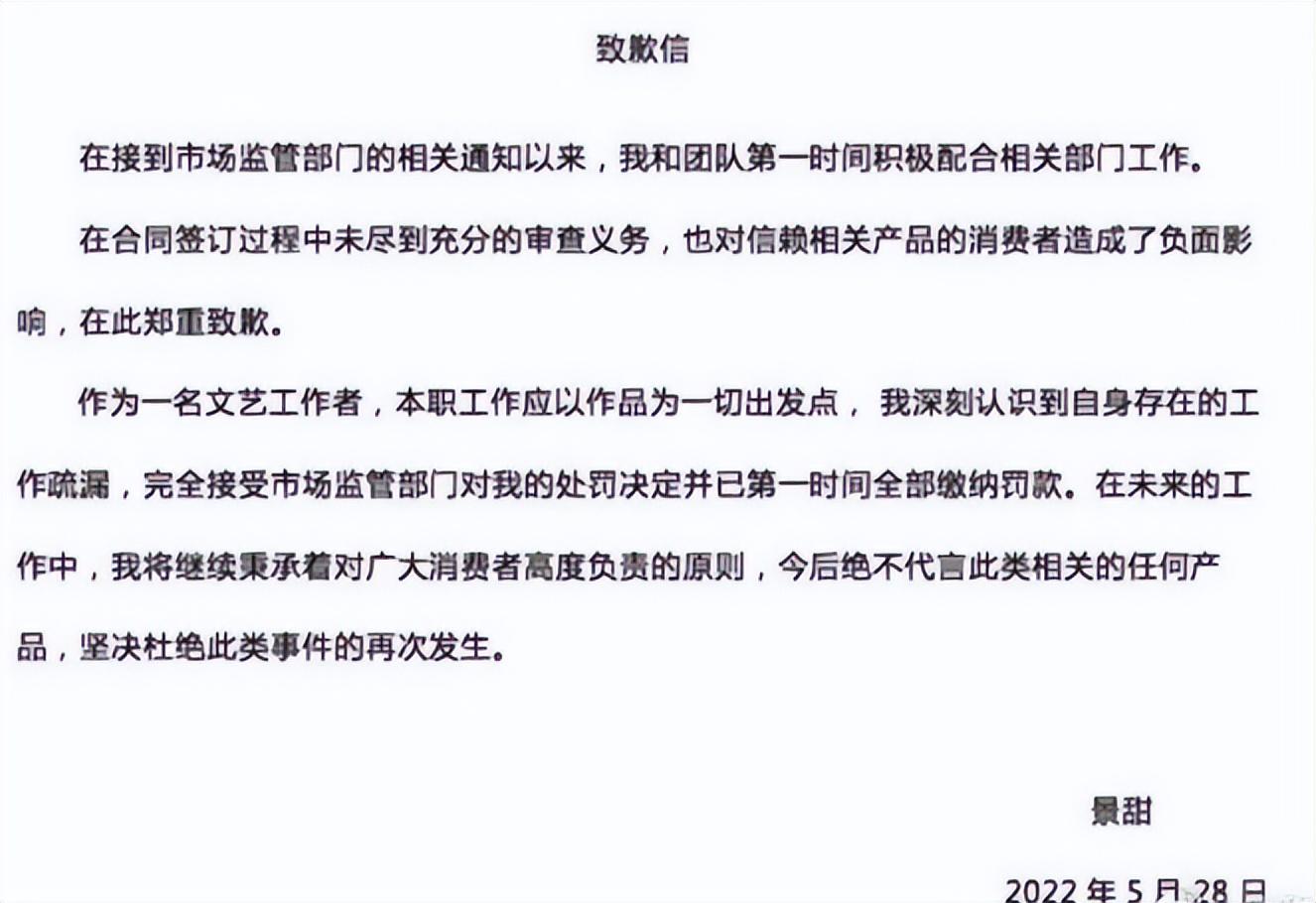 而景甜在被爆出将被罚款后,过了不到一个小时,马上在社交媒体上发文致歉,称已知今后不会再犯。