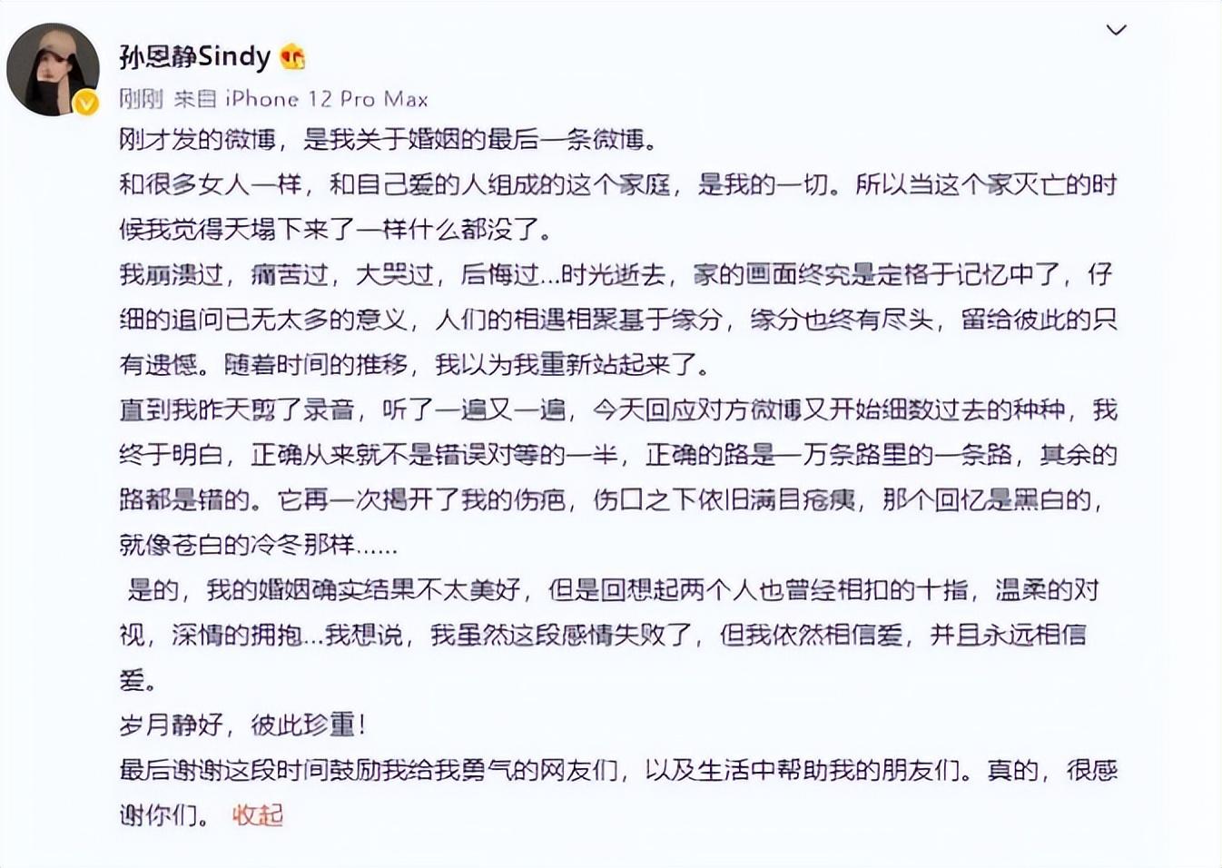 本以为事情已经闹到了这一步,原配孙恩静会将事情弄到水落石出才罢休,但没想到她选择了结束这场闹剧,发文称争论已无意义,希望彼此珍重。