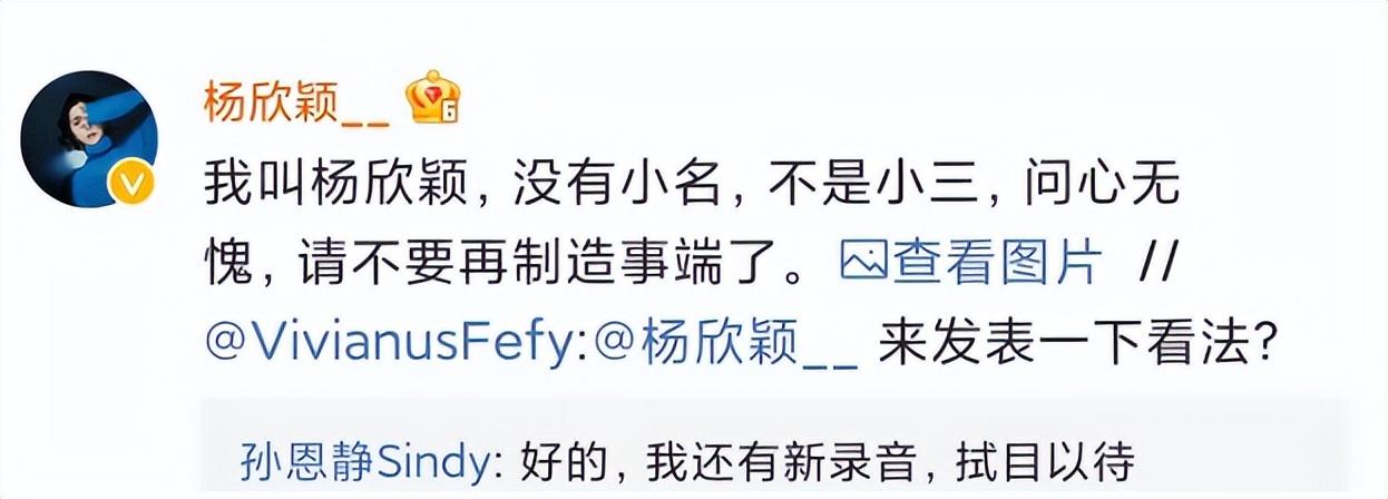而杨欣颖面对网友们铺天盖地的“小三”指控,也发文否认,称自己问心无愧,希望孙恩静不要制造事端。