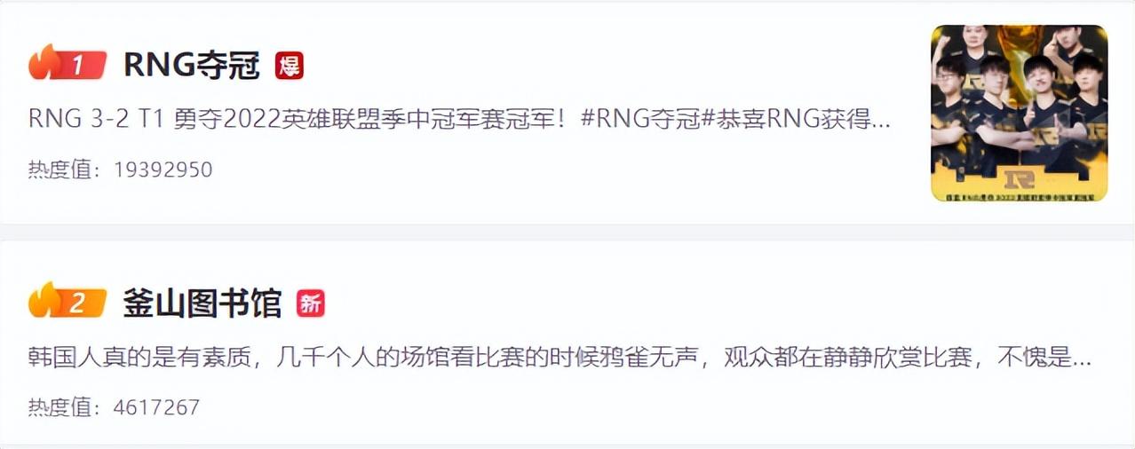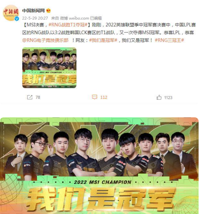 5月29日,网游《英雄联盟》的季中冠军赛(简称MSI)上,中国LPL赛区的RNG战队击败了韩国LCK赛区的T1战队,再次斩获了冠军。