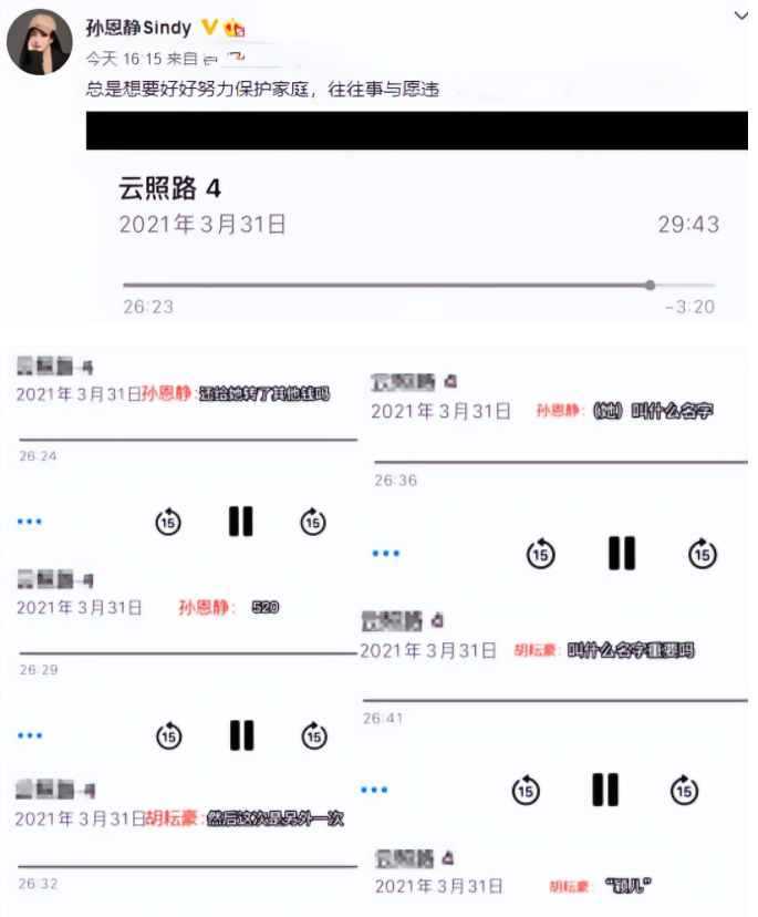 在胡耘豪的声明发布没多久,孙恩静就曝光了一段去年三月时,她与胡耘豪的交谈录音。
