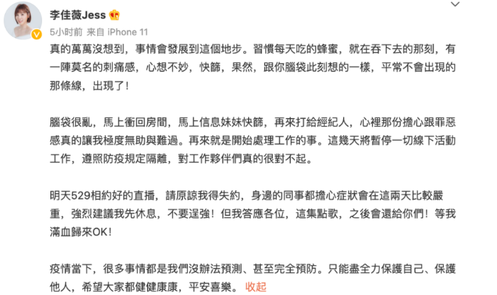 而同一天,歌手李佳薇也在社交平台上发布动态,表示自己确诊了新冠。