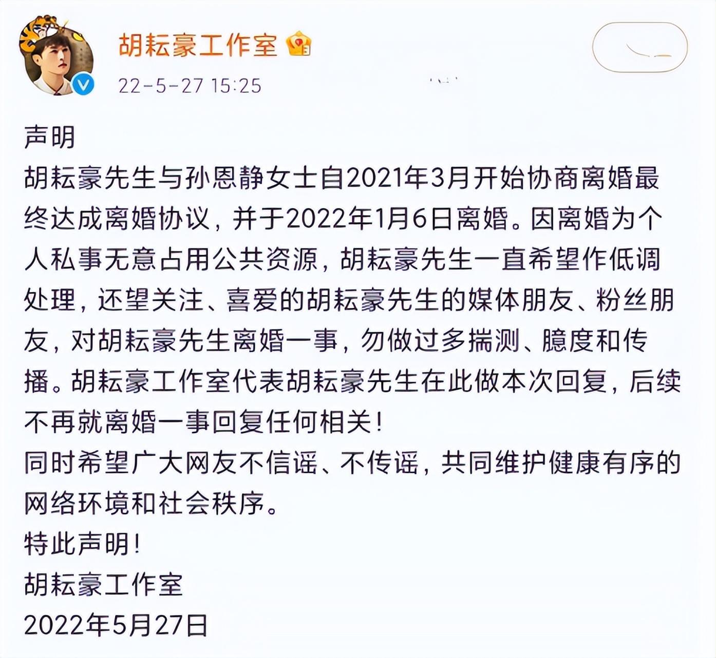 面对网友的质疑和讨论,胡耘豪只好紧急发布声明,称自己并没有婚内出轨,他与孙恩静在去年三月便已经协商离婚,在今年的年初已经正式离婚了。