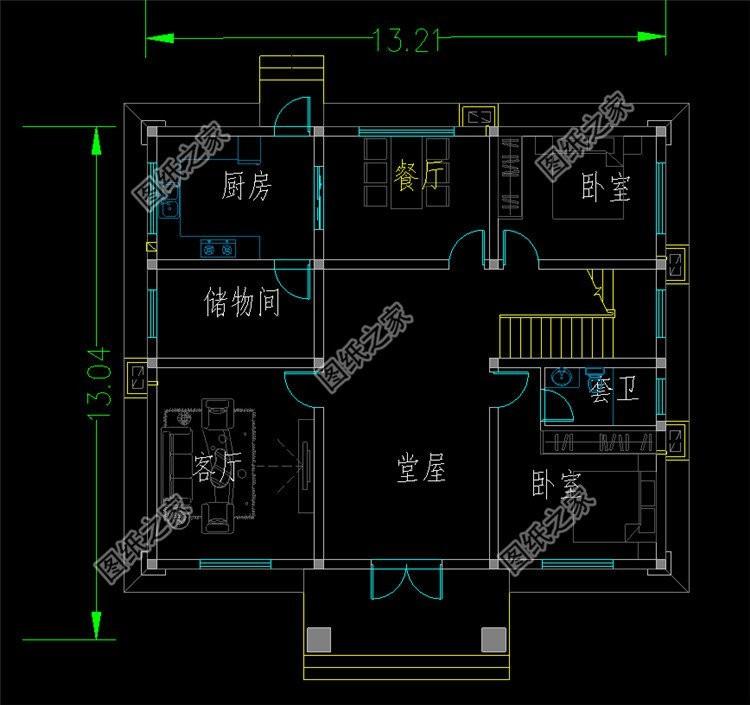 一层户型:堂屋、客厅、厨房、餐厅、储藏间、卧室(带卫生间)、卧室;
