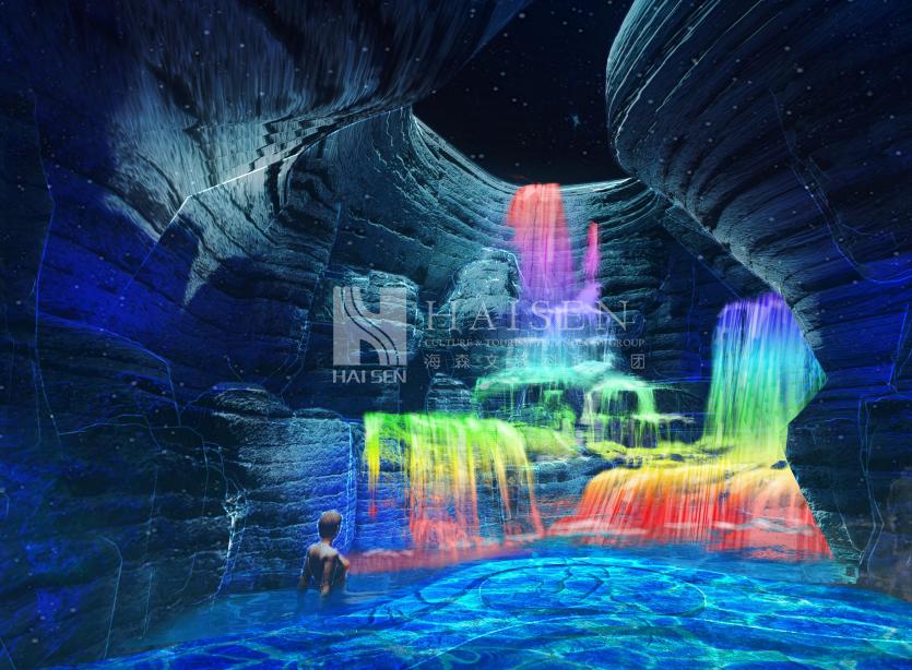 ③蓝洞潜伏:利用原有的矿道景观,利用真水,结合灯光效果和3D投影效果,配合各种宝石小品或宝石景观灯造景,将矿带景观改造为进行游泳潜浮活动的宝石水域潜浮项目。