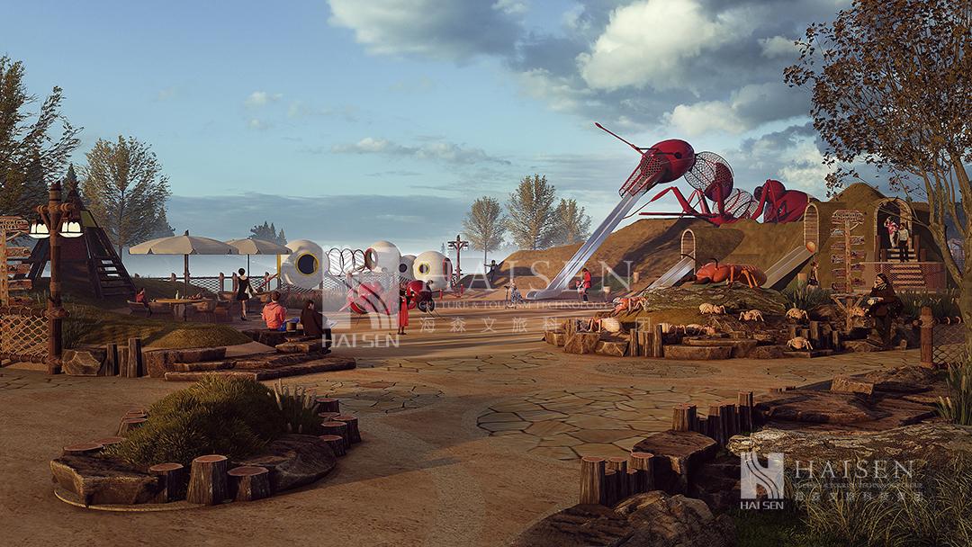 地心历险记--神秘岛中的大自然中:巨型蚂蚁、能供飞行的蜜蜂、成片的红蘑菇、袖珍大象等奇珍异兽和硕大的奇花异果都能提炼为元素,对游乐设备、坐凳和灯具进行创意包装。由于是泛自然的主题,可是多用质感自然的木材和石头去打造。儿童游玩区域有相当的面积,散置松针和树皮,呼应主题的同时也有透水环保的作用。沿儿童游玩空间结合林下休闲空间,让景观绿化是有参与感又能遮阴庇护,能照顾到亲子游特殊呵护人群的需求,提高游园体验感和自然舒适性。