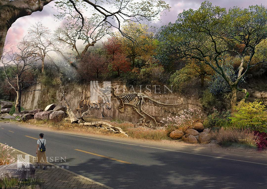 该区以岩石地貌、恐龙骨骼、枯木等元素为主,打造远古荒芜感:景观塑石展现一个洞口式的入口构筑物IP;沿主干道两旁放置枯木、恐龙化石,对沿路远近景多处被开挖山体裸露立面进行加固处理,局部结合浮雕塑造艺术岩壁,在游客行进过程中慢慢加深探索气氛。