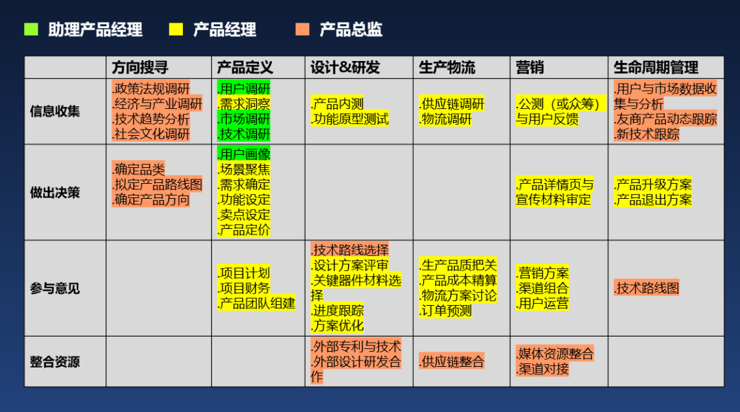 产品经理是产品的第一负责人,要对产品的成败负责。根据职能不同分为不同的级别,不同的级别要完成不同的功能。比如方向寻找、产品定义、设计研发、生产物流、营销、生命周期管理。
