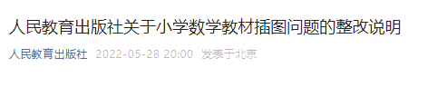 1. 人教社致歉!28日晚,人民教育出版社发布一则整改说明称,近期该社小学数学教材插图在网上受到批评和质疑,引起了社会各界对教材质量的担心,该社深感自责和内疚,表示深深的歉意。目前已成立工作专班,全面负责小学数学教材插图整改工作,并表示到今年9月1日前全面整改到位,确保2022年秋季学期开始按时使用新教材。(人民教育出版社)