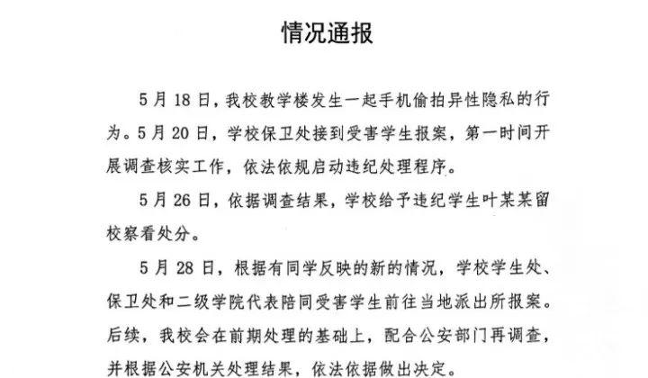 2. 浙江传媒学院通报“手机偷拍事件” 28日,浙江传媒学院发布一则情况通报称,该校日前发生一起手机偷拍异性隐私的行为。已给予违纪学生叶某某留校察看处分,后续会配合警方再调查。(浙江传媒学院)