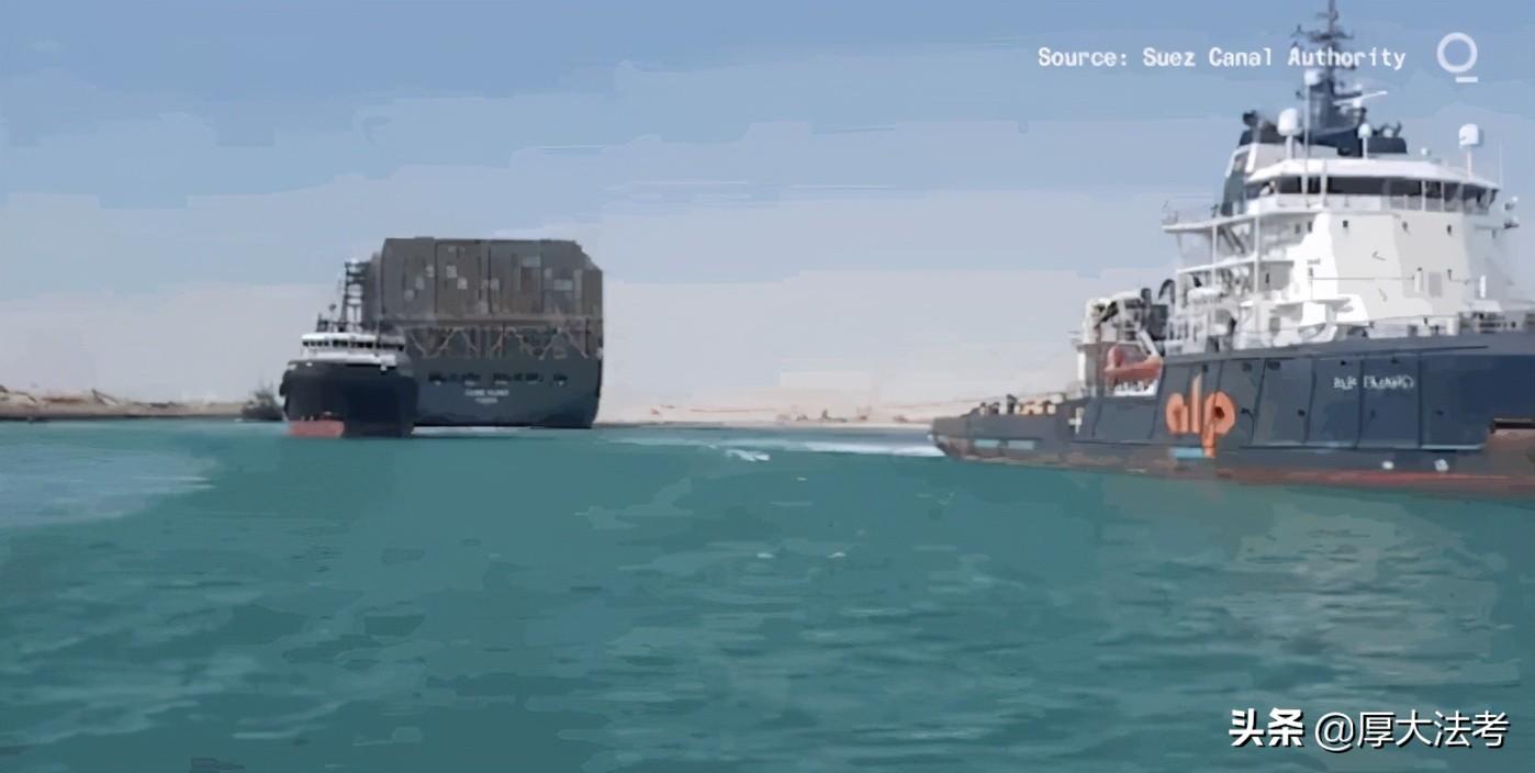 3月24日苏伊士运河管理局派出9艘拖船参与救援工作,搁浅货船被拖至岸边。