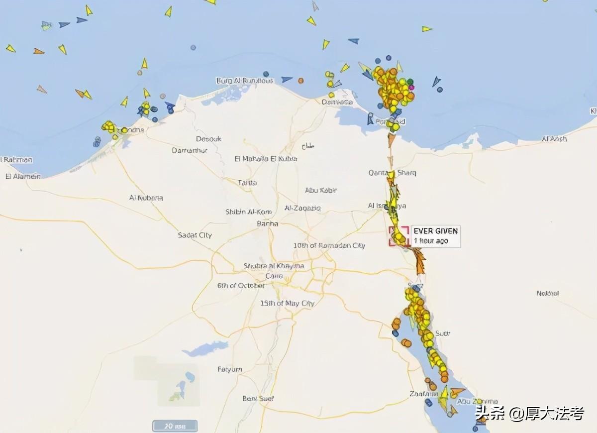 2021年3月23日早8时,“长赐号”(货轮约长400米,宽59米,重22万吨,是营运中的最大型巨型船舶之一)超大型货柜轮在从红海北向进入苏伊士运河时,于河口南端6海里处意外触底搁浅,造成苏伊士运河大堵塞。