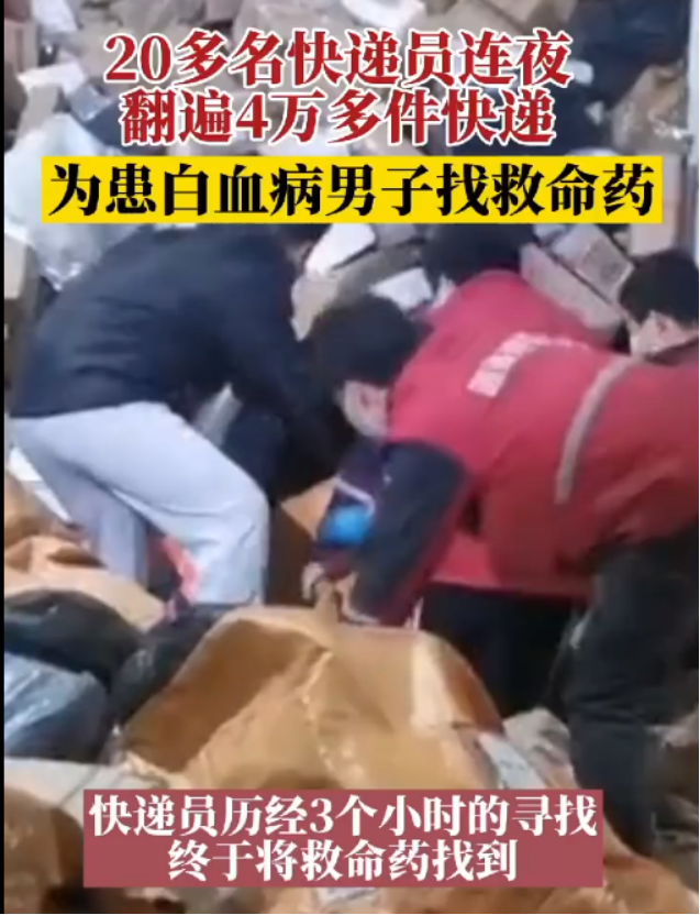2、20名快递小哥翻4万件快递找救命药 16日,河北沧州肃宁某速递转运中心,20名快递小哥在4万件因疫情滞留而堆积如山的快递中,为一名白血病患者寻找急需的救命药。经过3个多小时寻找,邮寄药物的包裹被成功找到。(@人民网、@河北青年报)