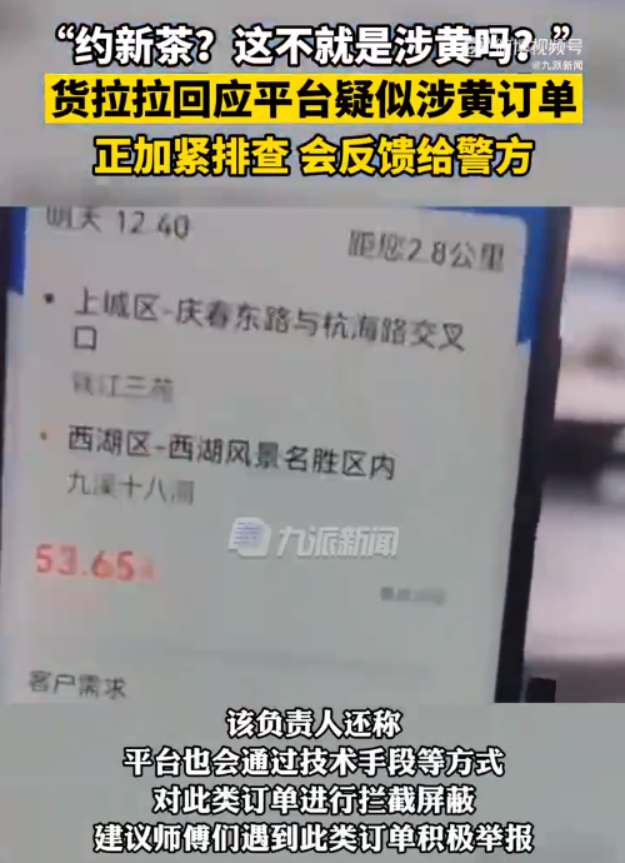 4、货拉拉回应平台疑似涉黄订单 近日,有网友爆料称,有人用暗语在货拉拉平台发布疑似涉黄订单。20日,浙江杭州货拉拉回应,技术部门正在紧急排查该订单情况,了解到源头后,会对下单人进行账号管控,并收集信息提供给警方,同时平台也会通过技术手段等方式对此类订单进行拦截屏蔽。(九派新闻)