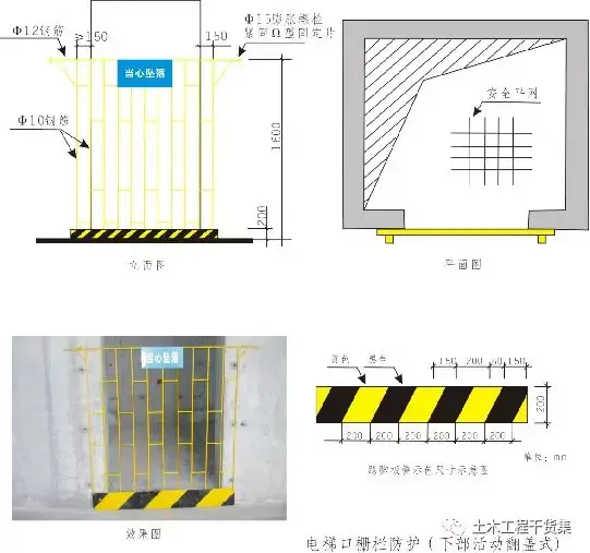 电梯井软硬防护做法,采用Ф8圆钢,间距200*200mm,结构施工时进行预埋。(电梯安装前拆除防护钢筋网片,另作它用)。有条件项目电梯井可采用工具式水平软防护。