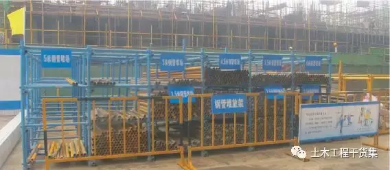 现场材料堆放支架搭设规范,材料分类清晰,标牌醒目。