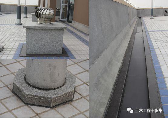 屋面细部装修深化设计,排水沟采用深色瓷砖或大理石铺贴,穿屋面管道根部采用花岗岩修饰,屋面设备基座、构件外饰采用花岗岩和瓷砖及其他材料修饰。屋面砖颜色搭配合理、分区排砖做到无半砖。