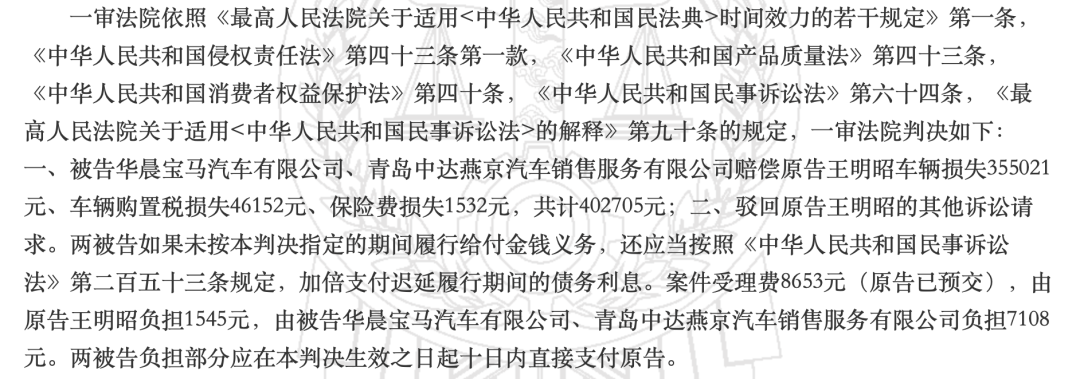 一审法院判令华晨宝马、经销商赔偿王某各项损失共计402705元。