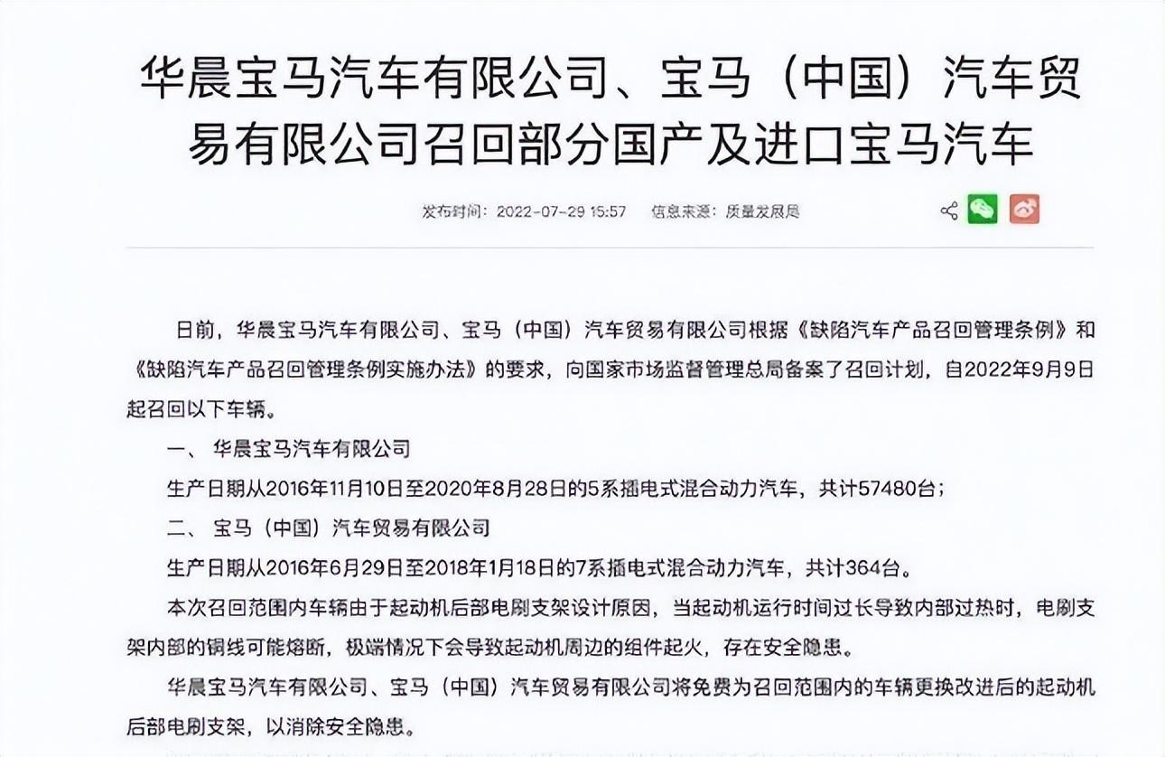 7月31日消息,据国家市场监管总局官网披露,日前,华晨宝马汽车有限公司、宝马(中国)汽车贸易有限公司根据《缺陷汽车产品召回管理条例》和《缺陷汽车产品召回管理条例实施办法》的要求,向国家市场监督管理总局备案了召回计划,自2022年9月9日起召回57480台5系插混和364台7系插混。
